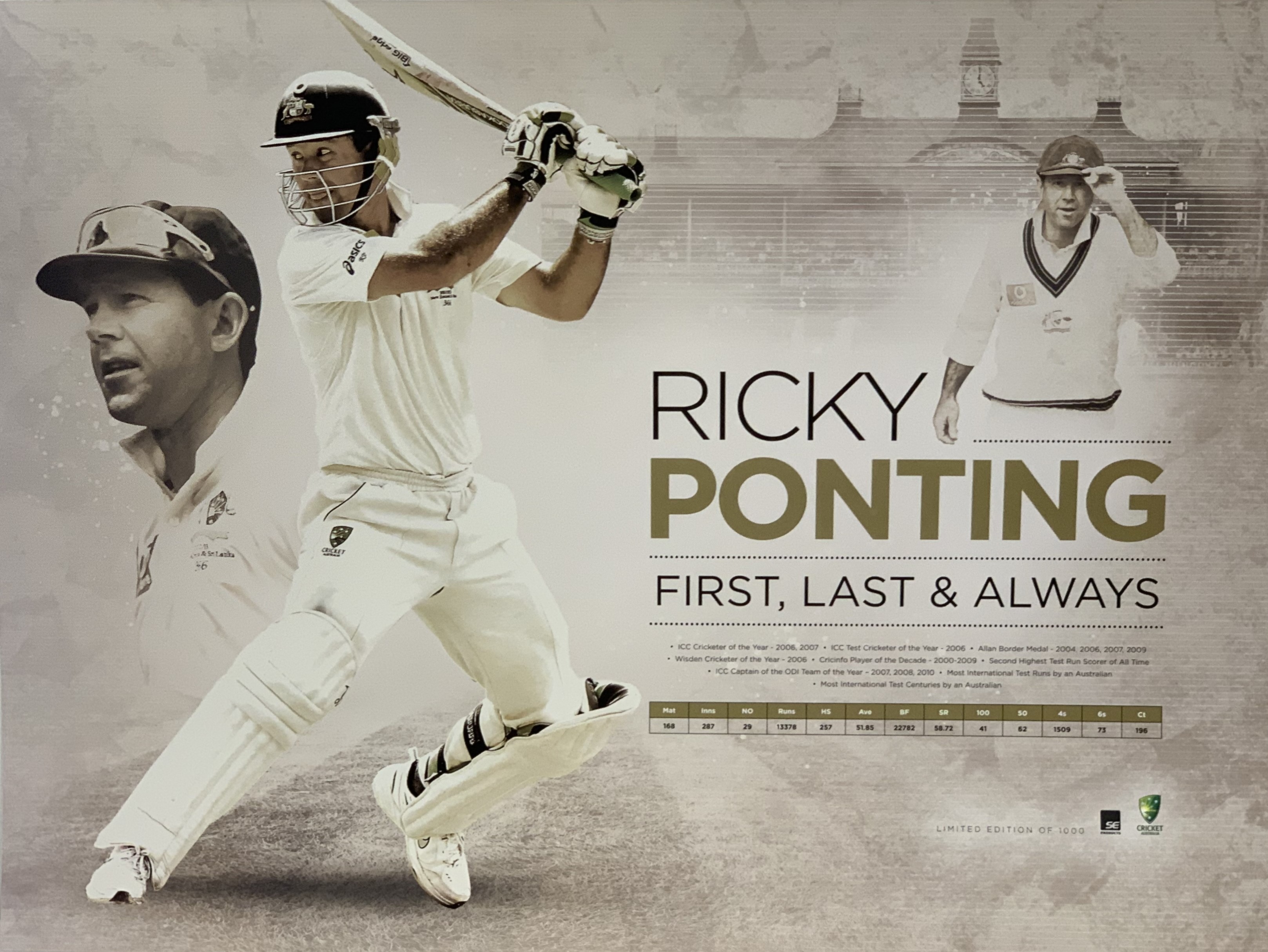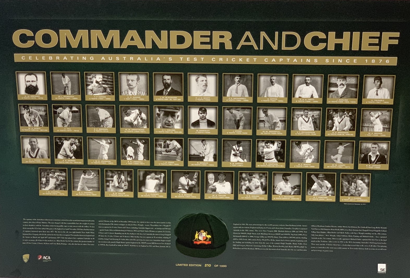 Australia: Three Limited Edition prints of Australian former test captains, Includes “Ricky Ponting – First, Last and Always”. Limited Edition of 1000, Official licensed product of Cricket Australia / SE products. Size: 80 by 60cm.; “The Final Campaign – A Testimonial to Steve Waugh”, Official licensed print by Cricket Australia & ESP (Elite Sports Properties). Size: 1000 by 69cm.; “Commander and Chief – Celebrating Australian Test Captains since 1876” Limited Edition print 370 of 1000 worldwide. Size: 73 by 50cm., (4)