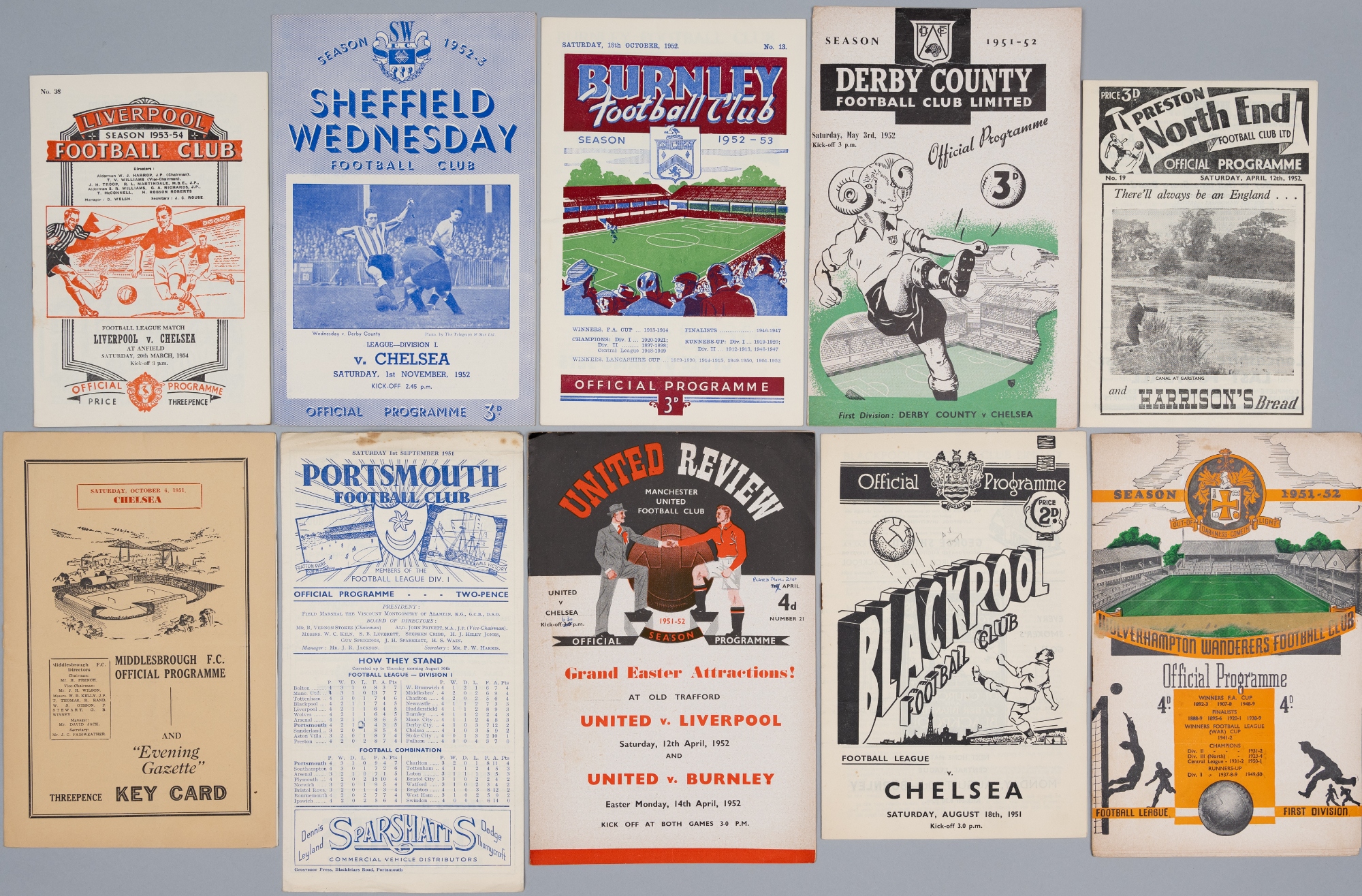 Chelsea collection of away programmes, seasons 1951-52, 1952-53, 1953-54, season 1951-52 19 of 21 complete except for at Aston Villa; 1952-53 (21) co