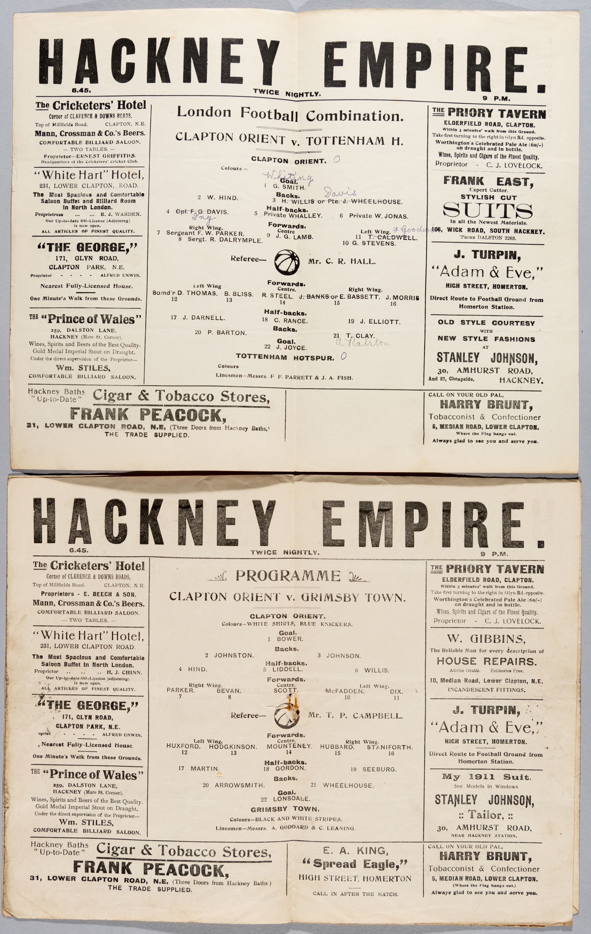 Two Clapton Orient home programmes, v Grimsby 1911-12 and v Tottenham Hotspur 1915-16, each fair with wear to each, Grimsby example staple removed a