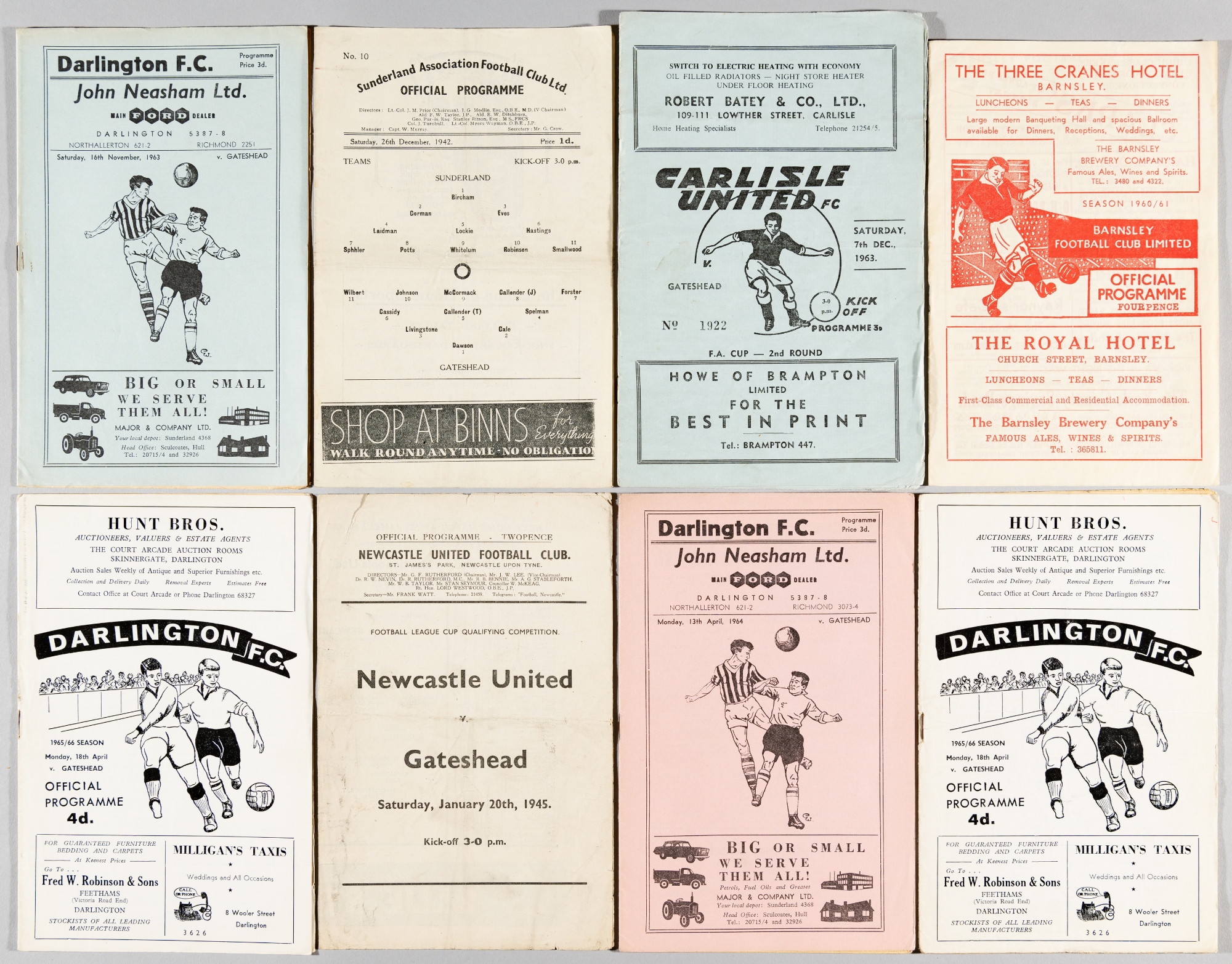 Gateshead collection includes first season Non-league 1960-61, including Northern Counties League (8) v Murton CW Durham C/Cup, v Barnsley FAC friendly/challenge matches v Scottish opposition (7); aways season 1960-61 (7) v Gateshead 20th January 1945, Sunderland v Gateshead 26th December 1942 (10), AGM agenda 28th June 1967 and copy book requiem for Redheugh by Geoff Esther, signed by author, fair with wear to majority, page edge wear, tears, creases and folds and some with annotations, (qty)