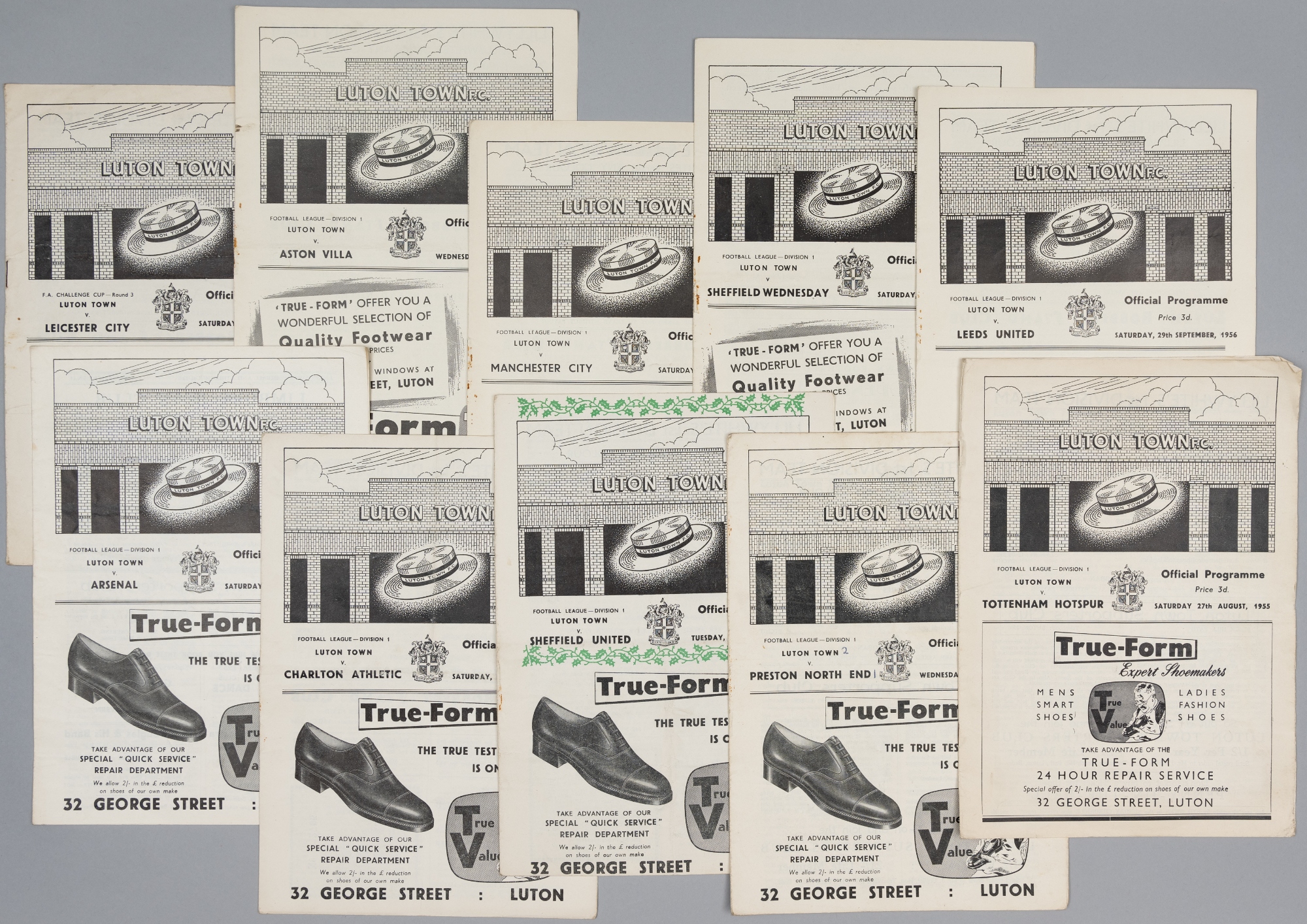 Luton Town home programmes, seasons 1955-56 and 1956-57, both full set of league and FA Cup, 1955-56 League (21) v Leicester City FAC; 1956-57 Leagu