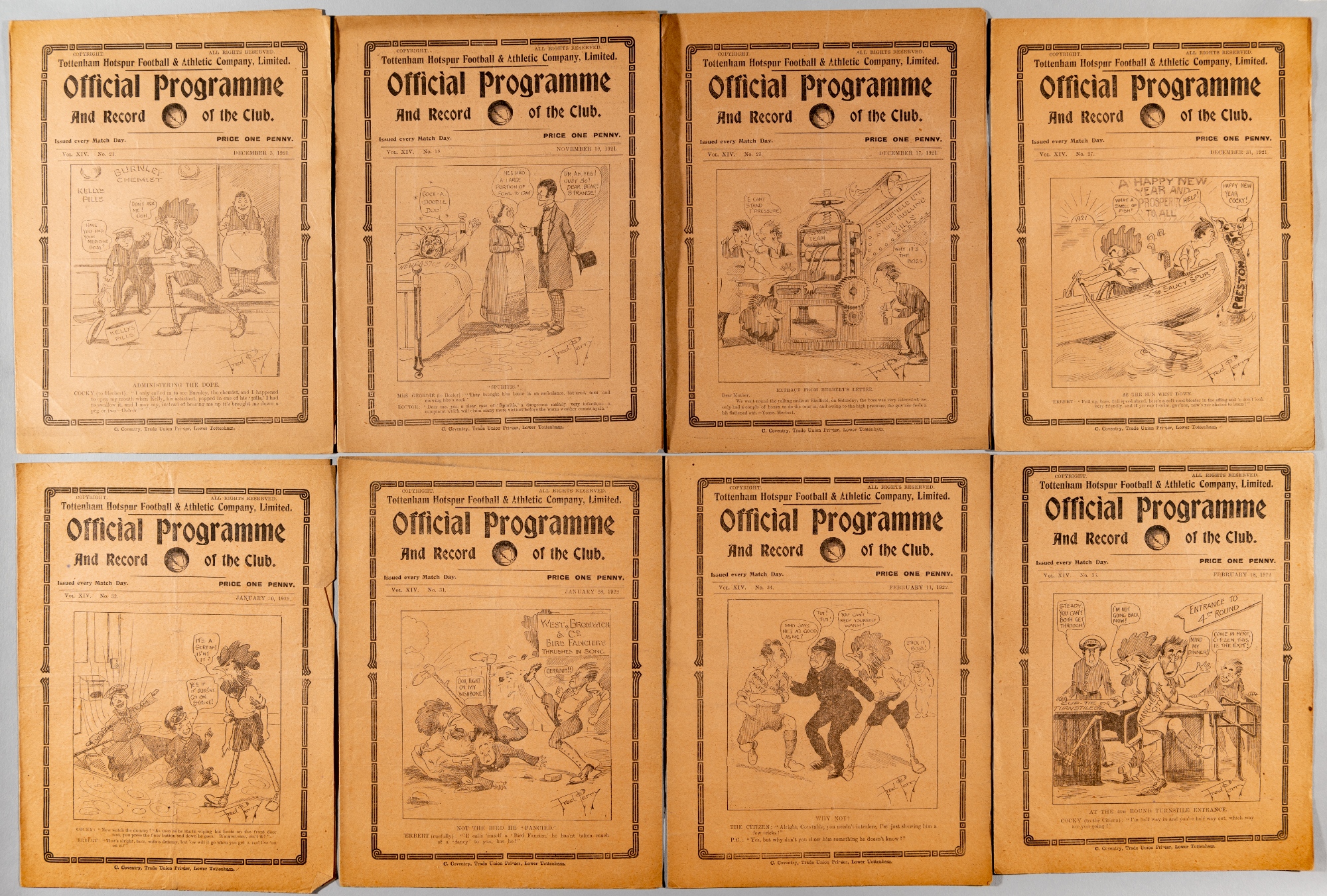 Sixteen Tottenham Hotspur home programmes from 1921-22 season, to include v Chelsea, Watford (FAC), Arsenal, Blackburn, Burnley, Sheffield United, Preston North End, West Bromwich Albion, Manchester City, Everton, Cardiff City, Sunderland, Huddersfield Town, Birmingham, Oldham Athletic, Blackburn Rovers, each fair to good with wear, creases, some annotations, (16)