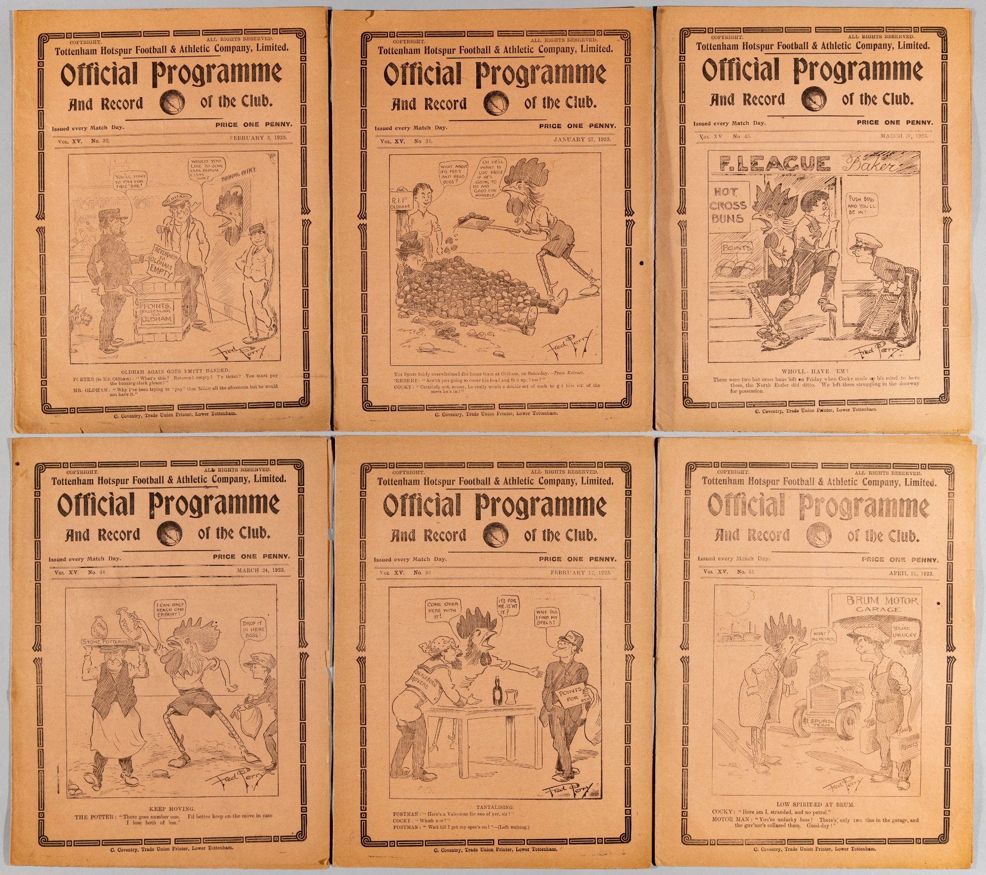 Six Tottenham Hotspur home programmes 1922-23 season, including v Manchester United, Oldham Athletic, Bolton Wanderers, Stoke, Preston North End and