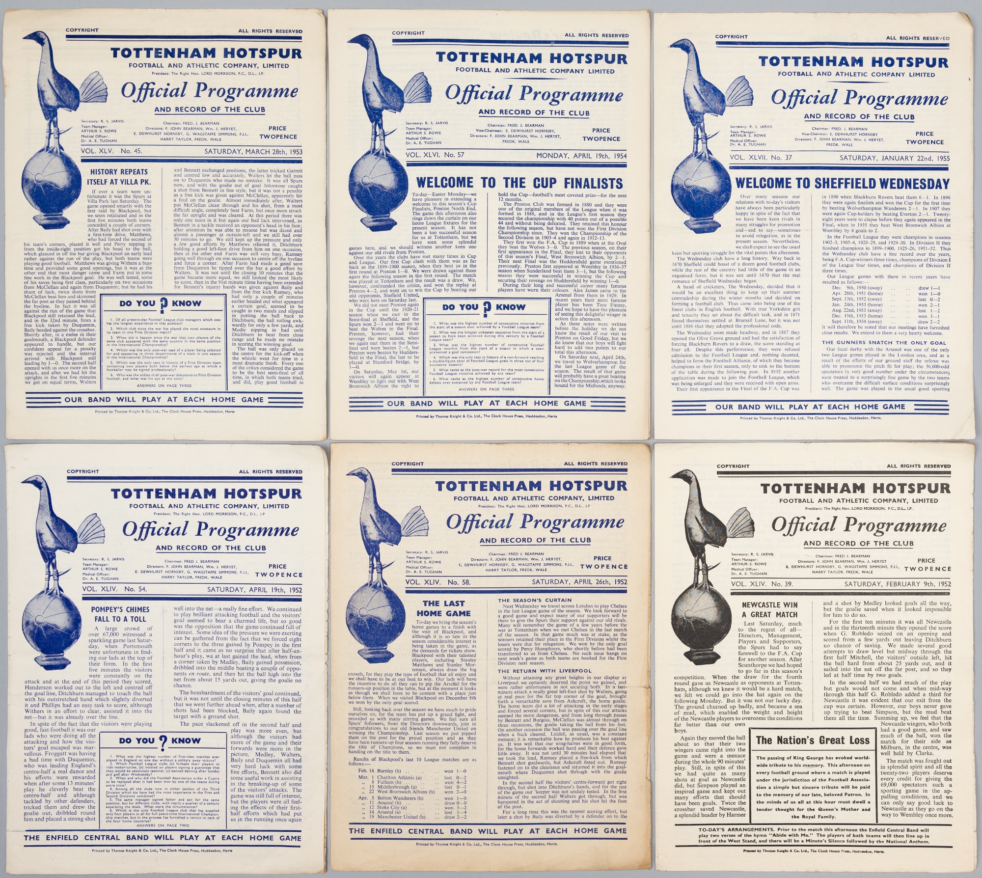 Tottenham Hotspur home programmes, seasons 1951-52 (25), 1952-53 (33), 1953-54 (32), 1954-55 (26), includes league, reserves, trial matches and friendlies, not checked for full season first team matches, overall condition is good, with minor quantity with splits in spines, horizontal creasing/folds, minor annotations, minor staining and discolouration of pages and page edges, (116)