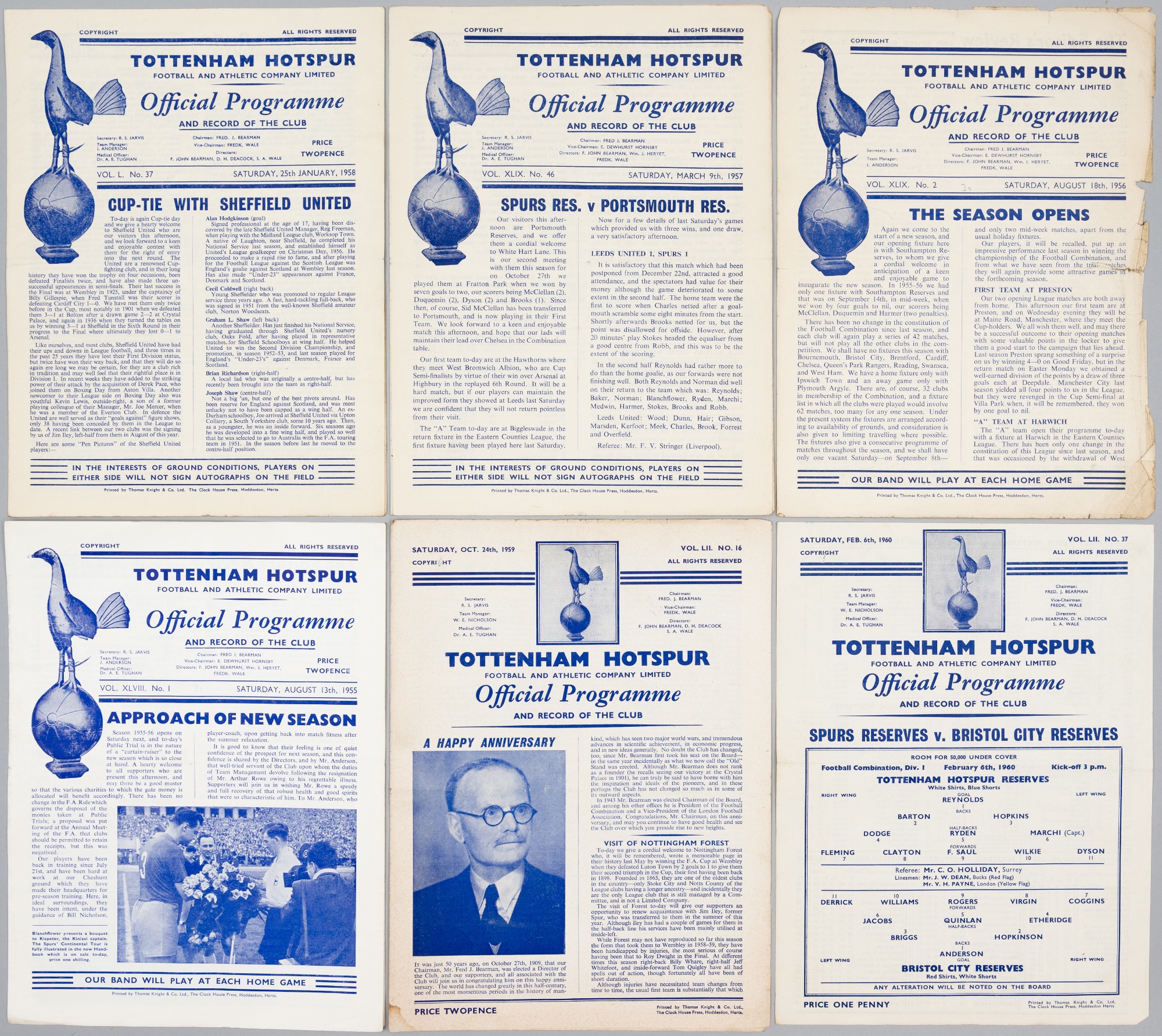 Tottenham Hotspur home programmes, season 1955-56 (30), 1956-57 (35), 1957-58 (31), 1958-59 (32), 1959-60 (31), includes league, reserves, trial matc
