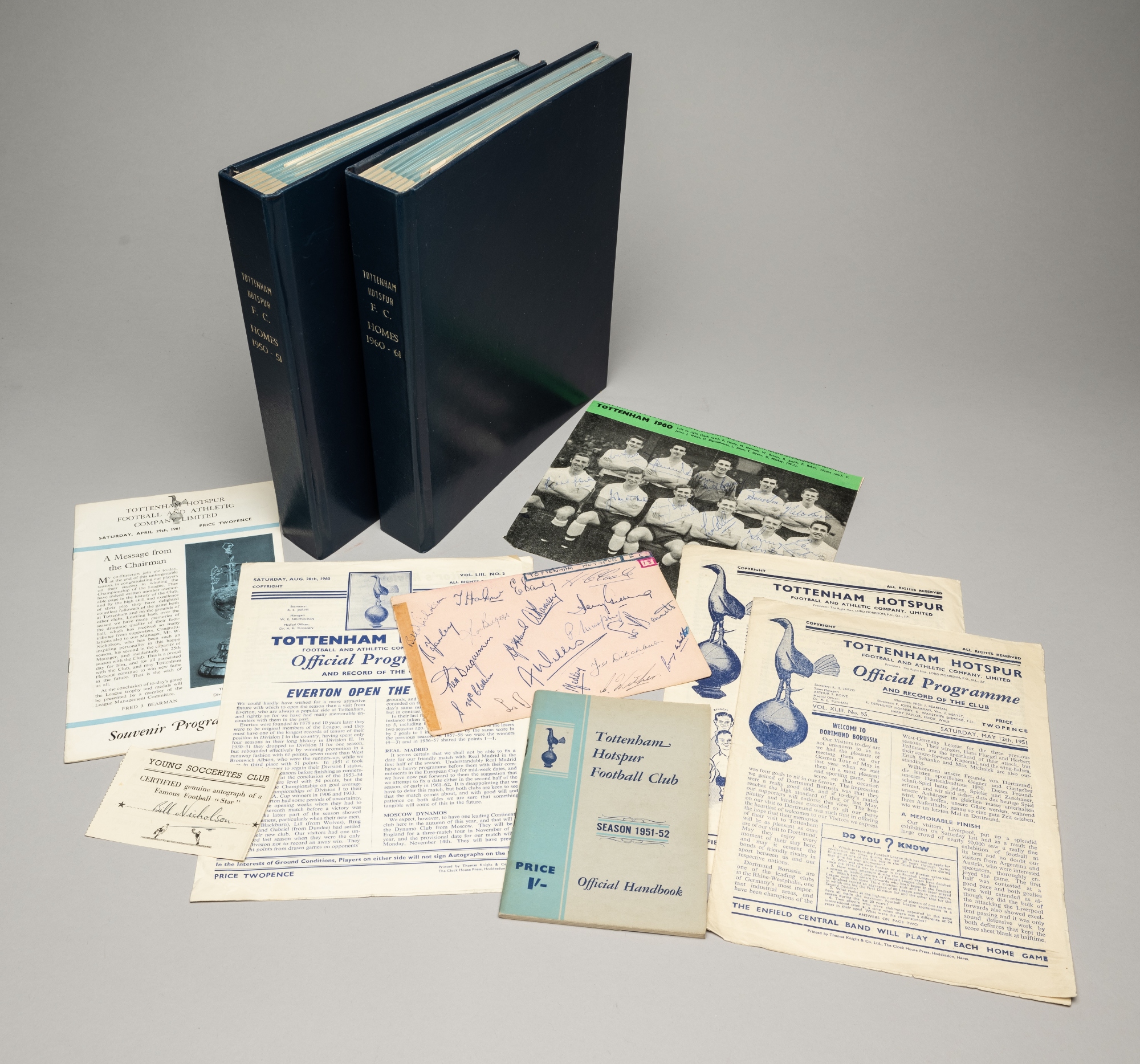 Sets of home programmes for Tottenham Hotspur's two Football League Division One winning seasons of 1950-51 and 1960-61 together with autographs of the championship teams, both contained in plastic sleeves within a dark blue Rexine volume, 1950-51 League homes, friendly v Borussia Dortmund and a club handbook, coms with a page removed from an album signed by the championship team NIcholson, Baily, Burgess, Ramsey, Ditchburn, Medley, Walters, Clarke, Duquemin, Willis et al 19 signatures in total; 1960-61 (double-winning season), League and Cup and friendly v Tblisi Dynamo, comes with a fully-signed magazine photo, Henry, Norman, Brown, Smith, Baker, Jones, White, Blanchflower, Allen, Dyson & McKay; plus a separate signature of manager Bill Nicholson