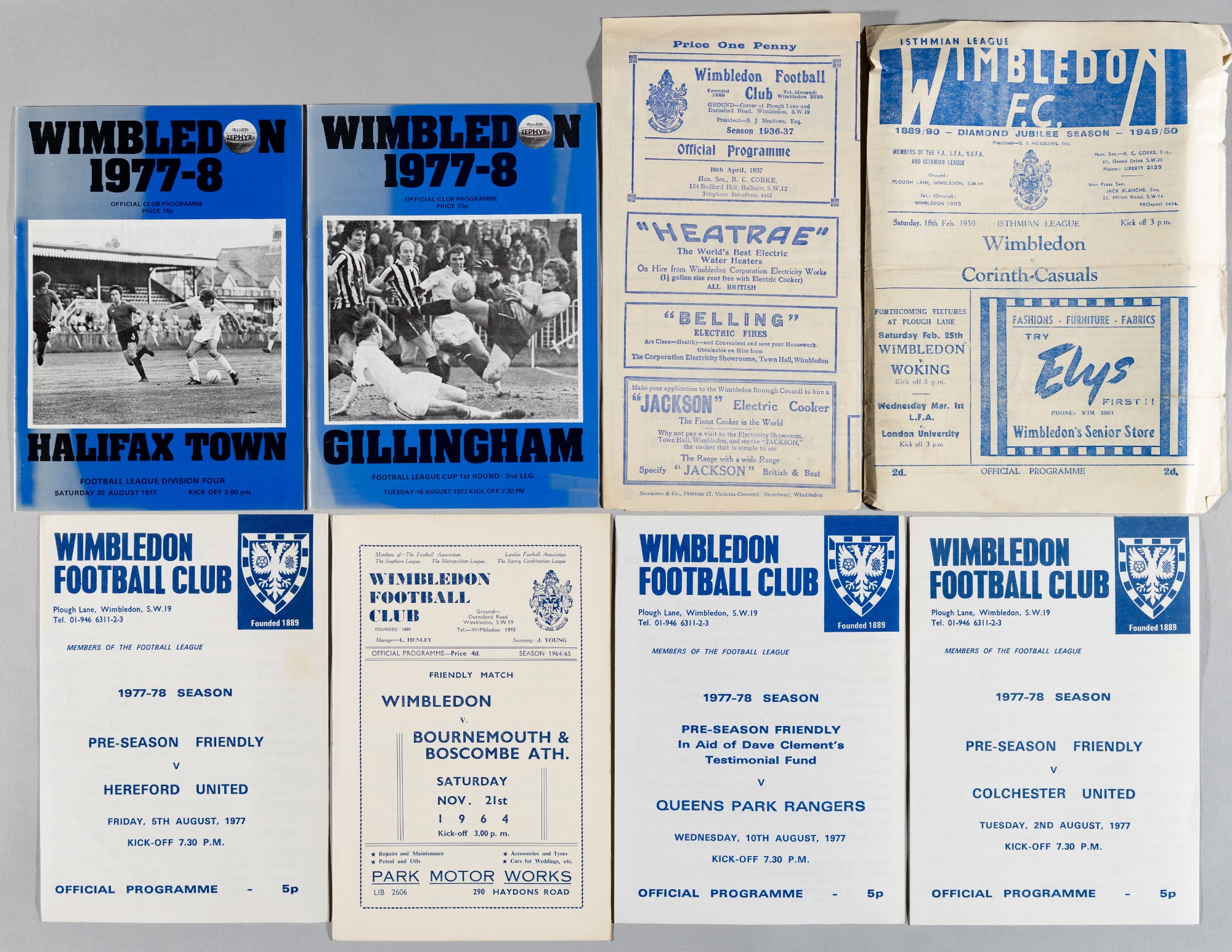 Selection of Wimbledon programmes including first season in League 1977-78, full set home League (23), friendlies and other matches (7), full set away League (23), Cups (2); sold with programmes include 1936-37 Kingstovian v Banstead MH S/F Surrey Senior Cup 10th April 1937, Wimbledon issued v Corinthian Casuals 1949-50, v Bournemouth (FR) 1964-65 and Fazines Dons Outlook selection, majority good condition, some with creases, (qty)