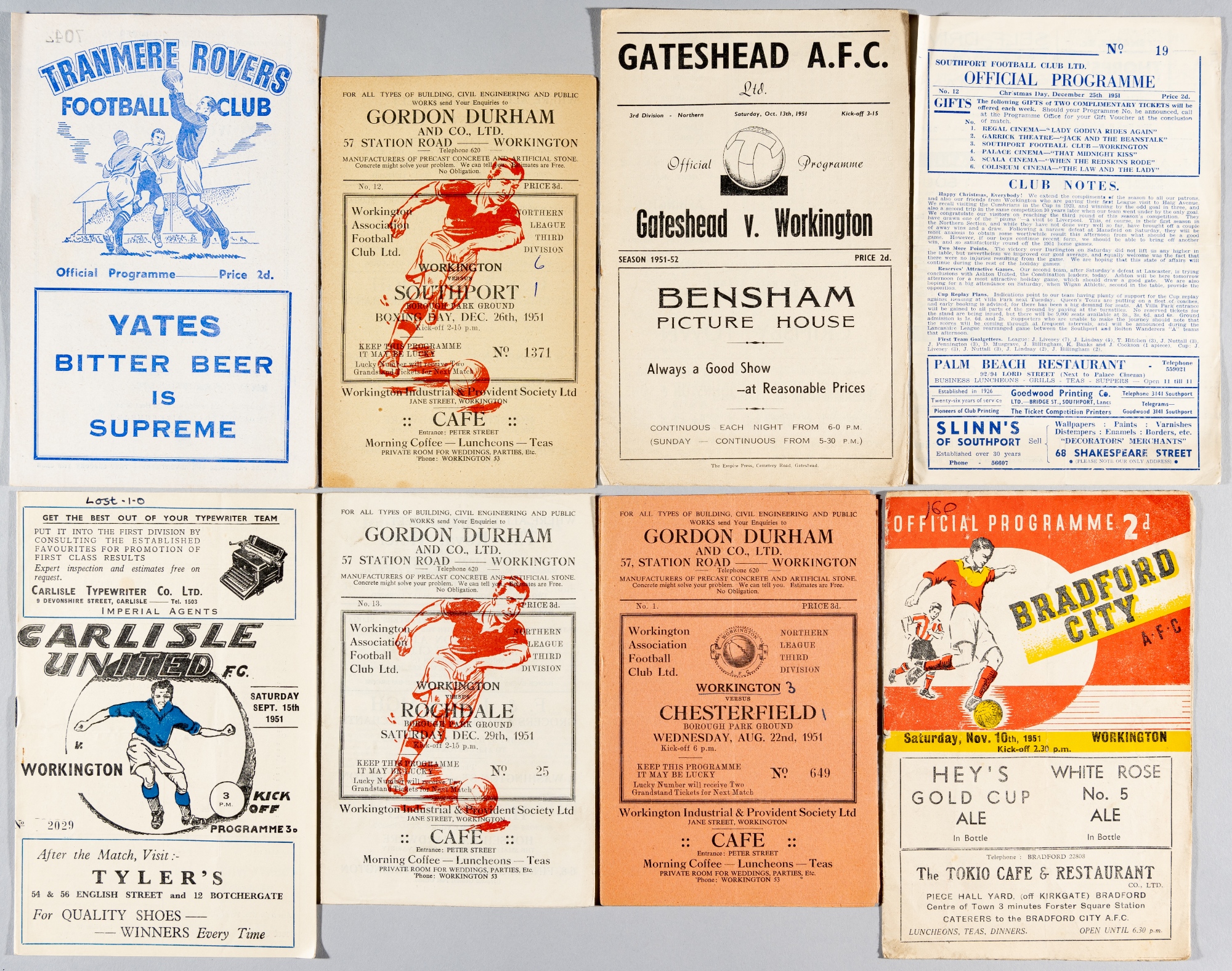 Workington first League season 1951-52, full set of home matches 1 to 24, missing only FAC v Witton Replay (23); sold with aways at Bradford City, Liverpool FAC, Accrington Stanley, (9), majority fair to good, with wear and some annotations in ink, some folds horizontal and vertical, (total 32)