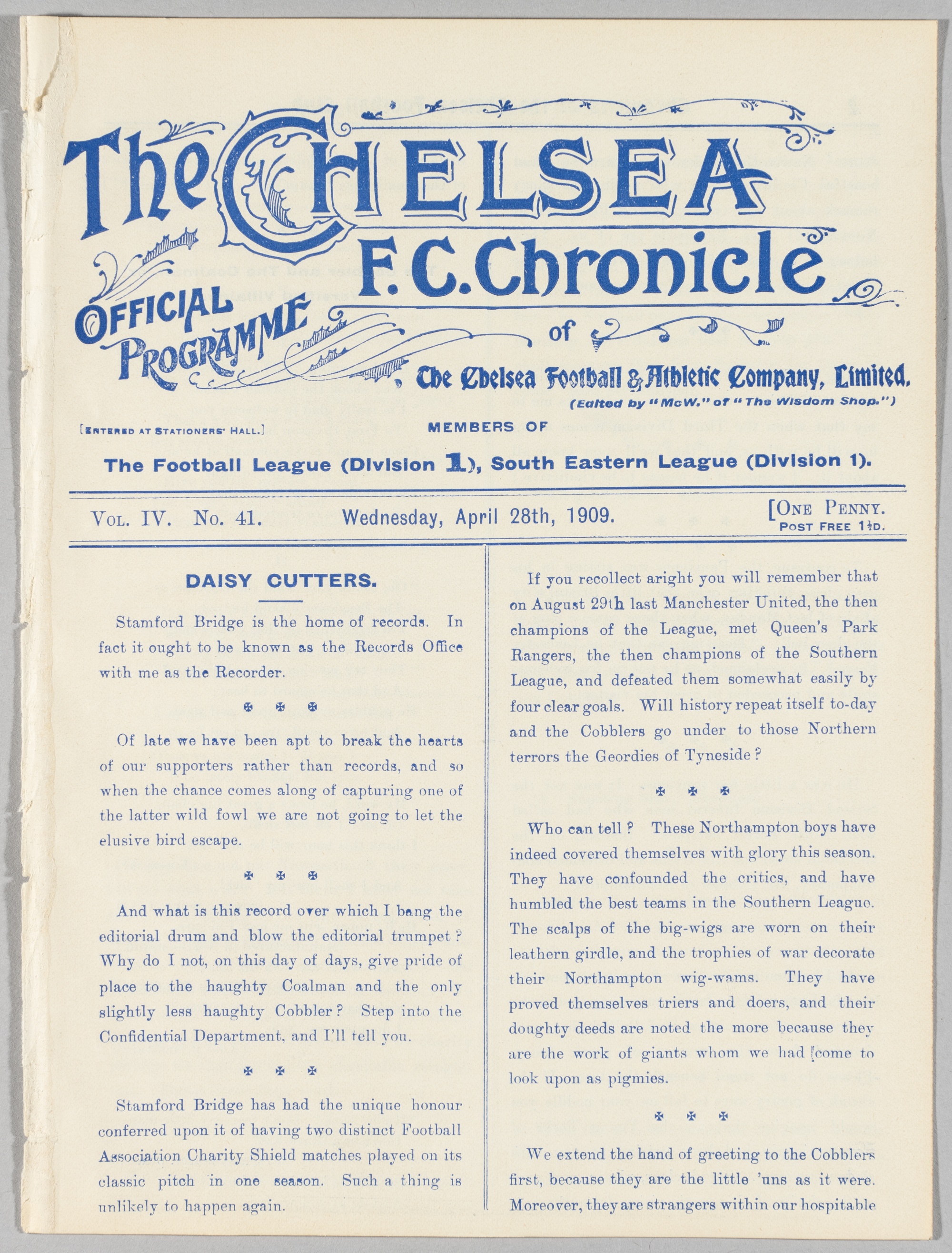 F.A. Charity Shield programme Northampton Town v Newcastle United plated at Chelsea (Stamford Bridge) 28th April 1909, Ex Bound Volume.
