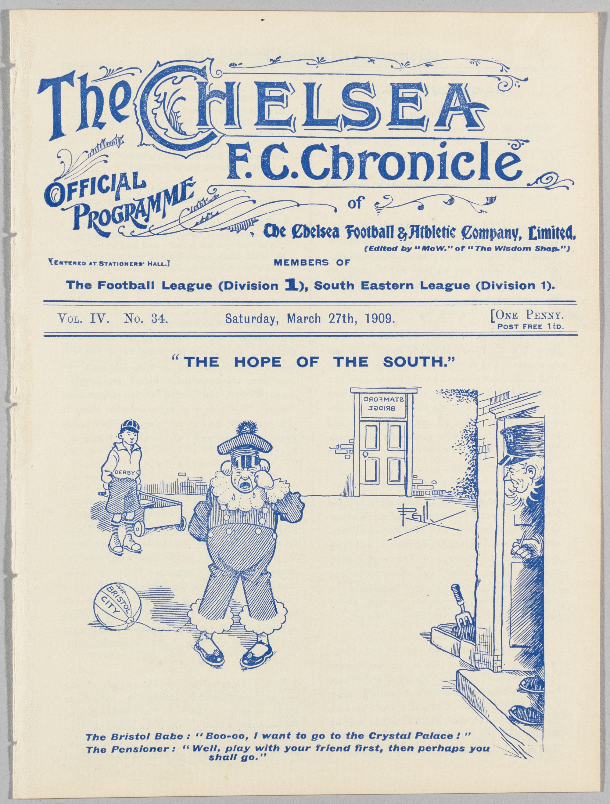 F.A. Cup semi-final programme Bristol City v Derby County played at Chelsea (Stamford Bridge) March 27th 1909, Ex Bound Volume.