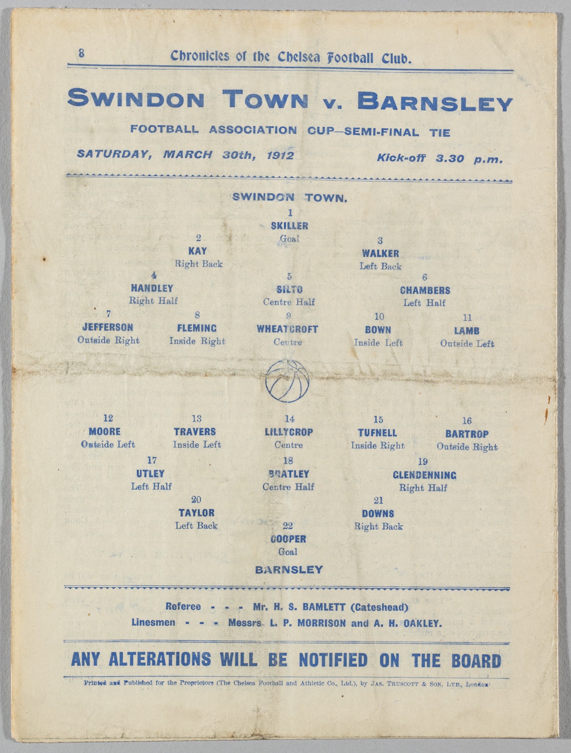 F.A. Cup semi-final programme Swindon Town v Barnsley, played at Chelsea's Stamford Bridge, 30th March 1912, 8-page, team line-up on reverse page, vertical and horizontal folds, grubby, stained
