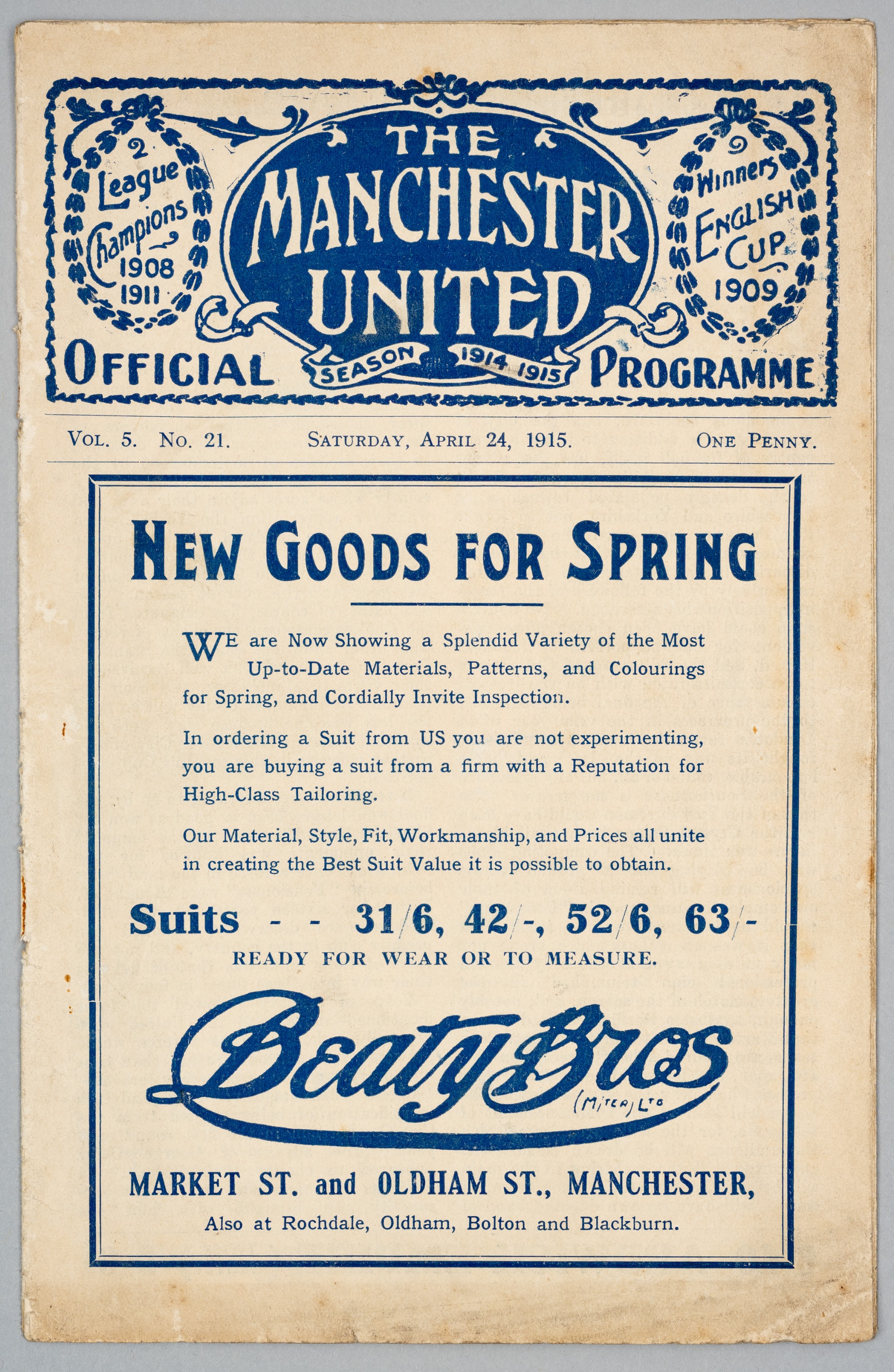 The very scarce 'Khaki' F.A. Cup Final programme Chelsea v Sheffield United, played at Manchester United's Old Trafford ground, 24th April 1915, 16-page, club issue for Vol.5 No.21, staples removed, covers slightly grubby, bears holes in spine where staples were removed, pencil scores to half time page, but generally good