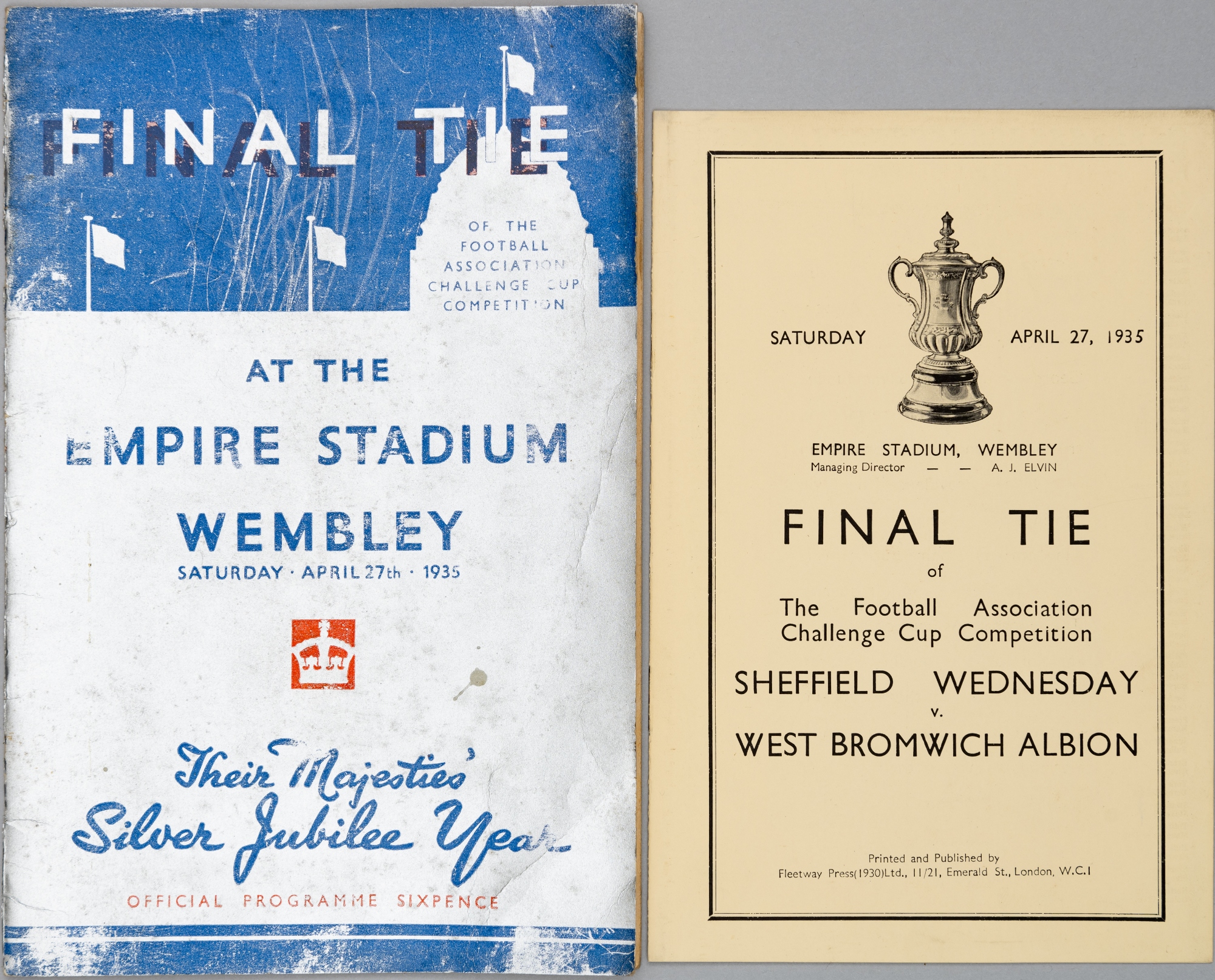 F.A. Cup Final programme Sheffield Wednesday v West Bromwich Albion, played at Wembley Stadium, 27th April 1935, 22-page, slight yellowing to interior pages, the usual condition issues with the silver paper covers, scratches, wear, crease, minor staple rusting; sold together with a 'pirate' issue for the same cup final, 8-page, good condition, (2)