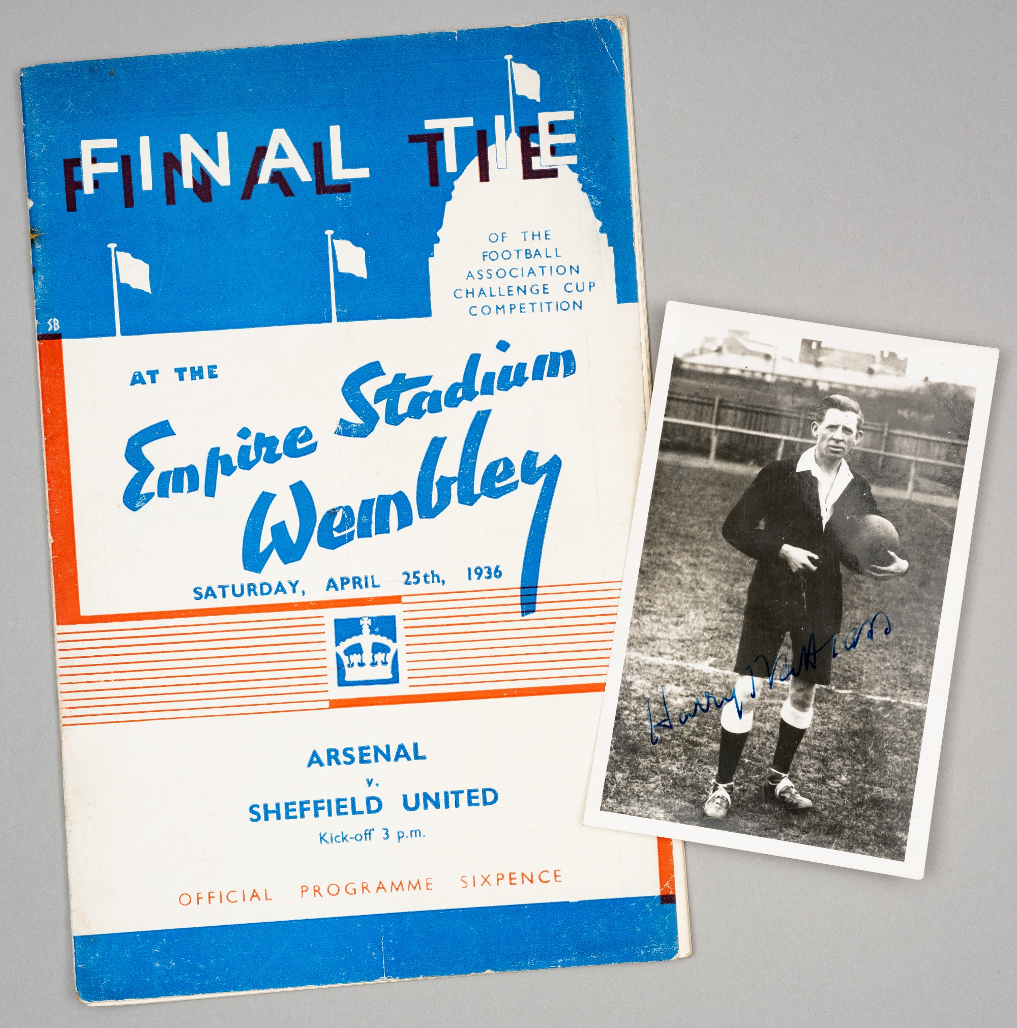F.A. Cup Final programme Arsenal v Sheffield United, played at Wembley Stadium, 25th April 1936, 22-page, staples removes and significant rust marks at staple areas and throughout, otherwise fair to good; sold together with a signed photograph of the match referee Harry Nattrass, (2)