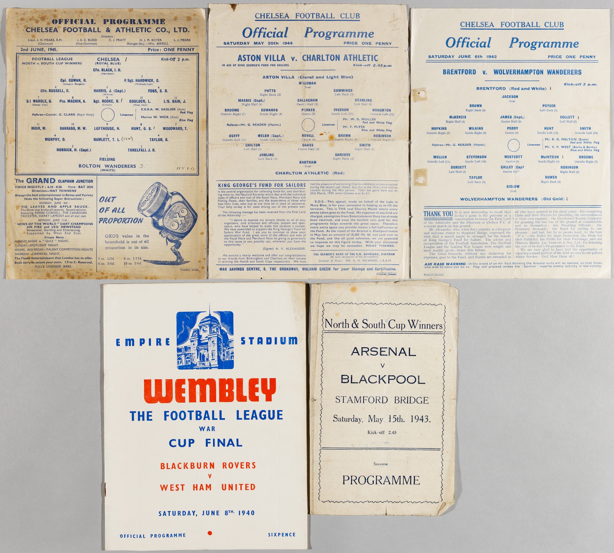 Football League Wartime Cup final programme Blackburn Rovers v West Ham United at Wembley 8th June 1940, sold with North South Wartime Finals all at Stamford Bridge 1942, including Brentford v Wolverhampton Wanderers 6th June 1942; Arsenal v Blackpool 15th May 1943 (pirate); Aston Villa v Charlton Athletic 20th May 1944; Chelsea v Bolton Wanderers 2nd June 1945, fair with wear to majority, punch hole repairs, stains and marks, creases and folds, page edge tears, (6)
