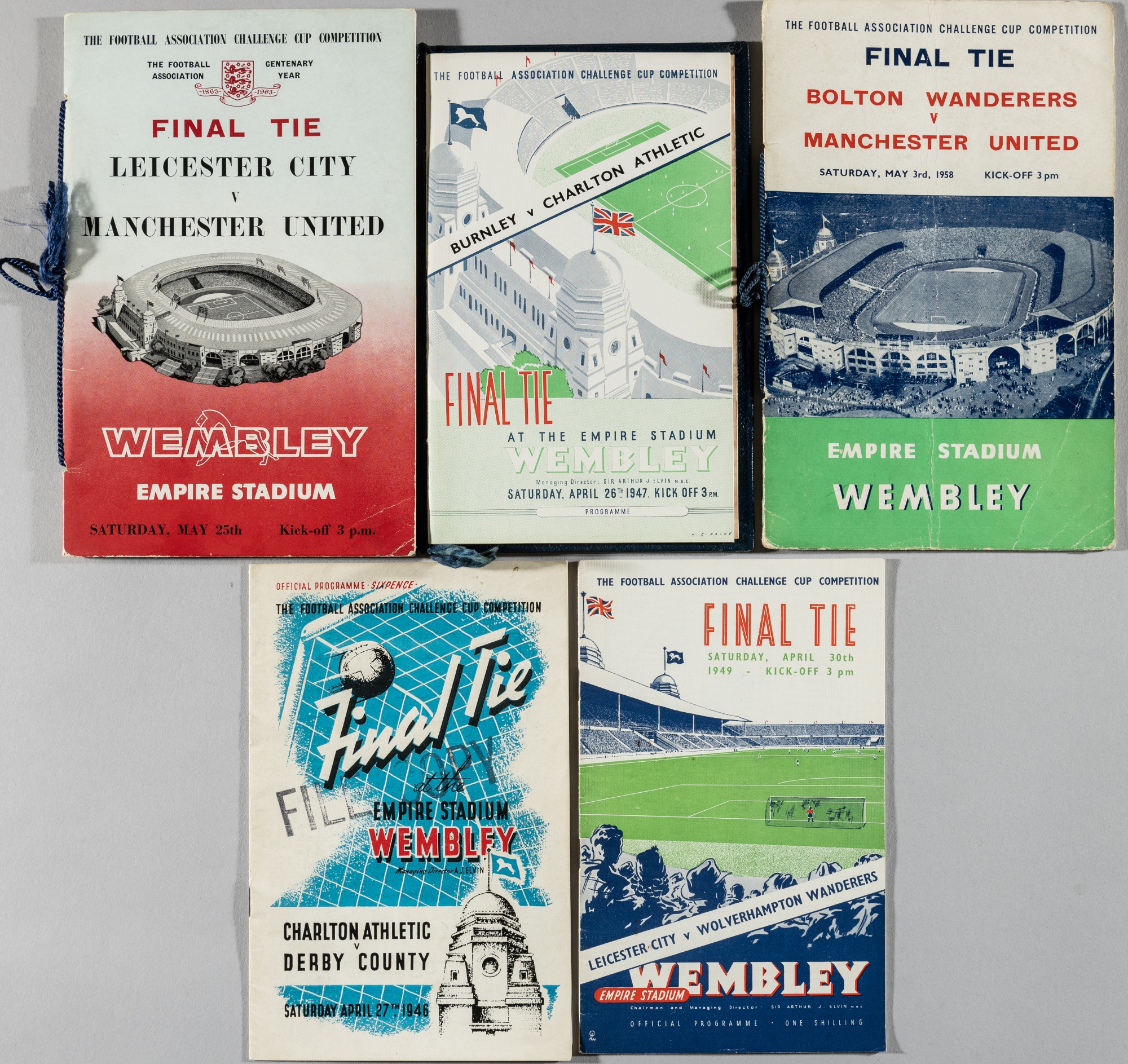 Interesting collection of non-standard F.A. Cup Finals programmes, 1946 Derby County v Charlton Athletic signed by four Derby players, 27th April 1946, marked 'File Copy'; 1947 Burnley v Charlton Athletic VIP Royal Box edition, enclosed in an embossed cover, 26th April 1947; 1949 Leicester City v Wolverhampton Wanderers VIP Royal Box edition, no cover, 30th April 1949; 1958 Manchester United v Bolton Wanderers, unusual edition with some blank pages, 3rd May 1958; 1963 Manchester United v Leicester United VIP edition, 25th May 1963, each with minor wear, (5)