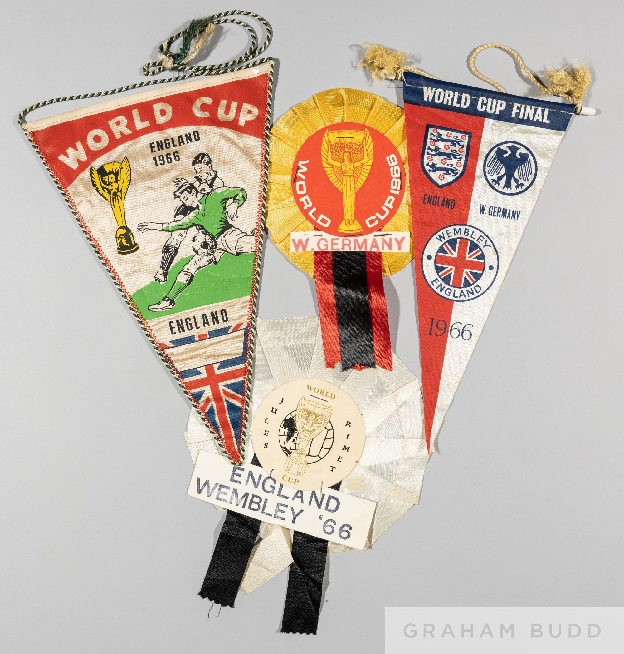 1966 World Cup rosettes and pennants, a pair of rosettes for England and West Germany for the Final; England supporters' pennants, one for the Final, the other for the tournament (4)