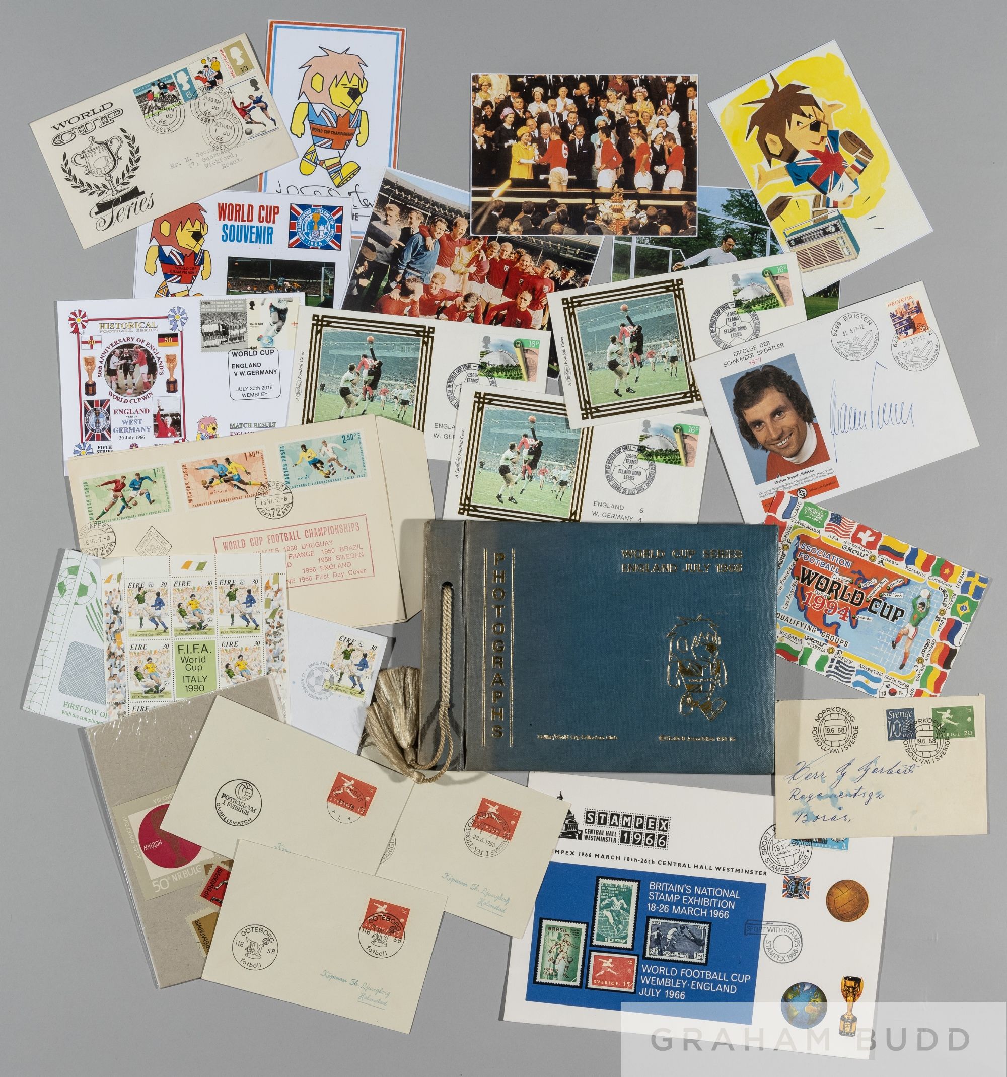 World Cup England 1966 selection of FDC issues, includes World Cup 1966 FD issue 1st June, Football World Cup final 30th June England winners; sold with selection post cards re: World Cup 1966, World Cup Willie photograph album (empty) and various postal items from other World Cups, (qty)