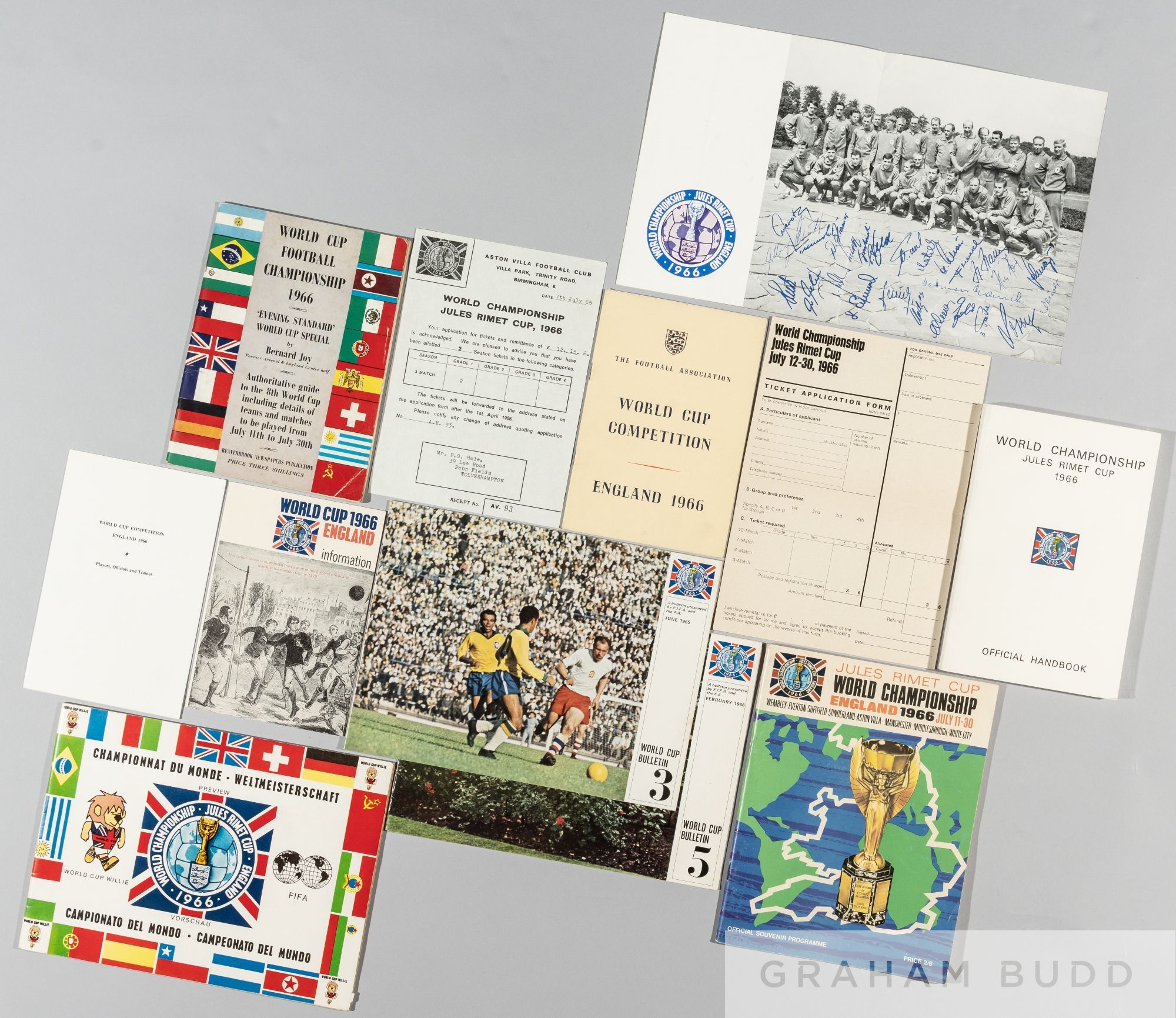 Football World Cup England 1966 interesting selection of brochures and booklets, relating to World Cup, includes FA itinerary for England, World Cup championship, official handbook 136-page, players and officials photographs England v Germany facsimile autographs, German brochure re: participating teams, World cup brochure, etc., (qty)