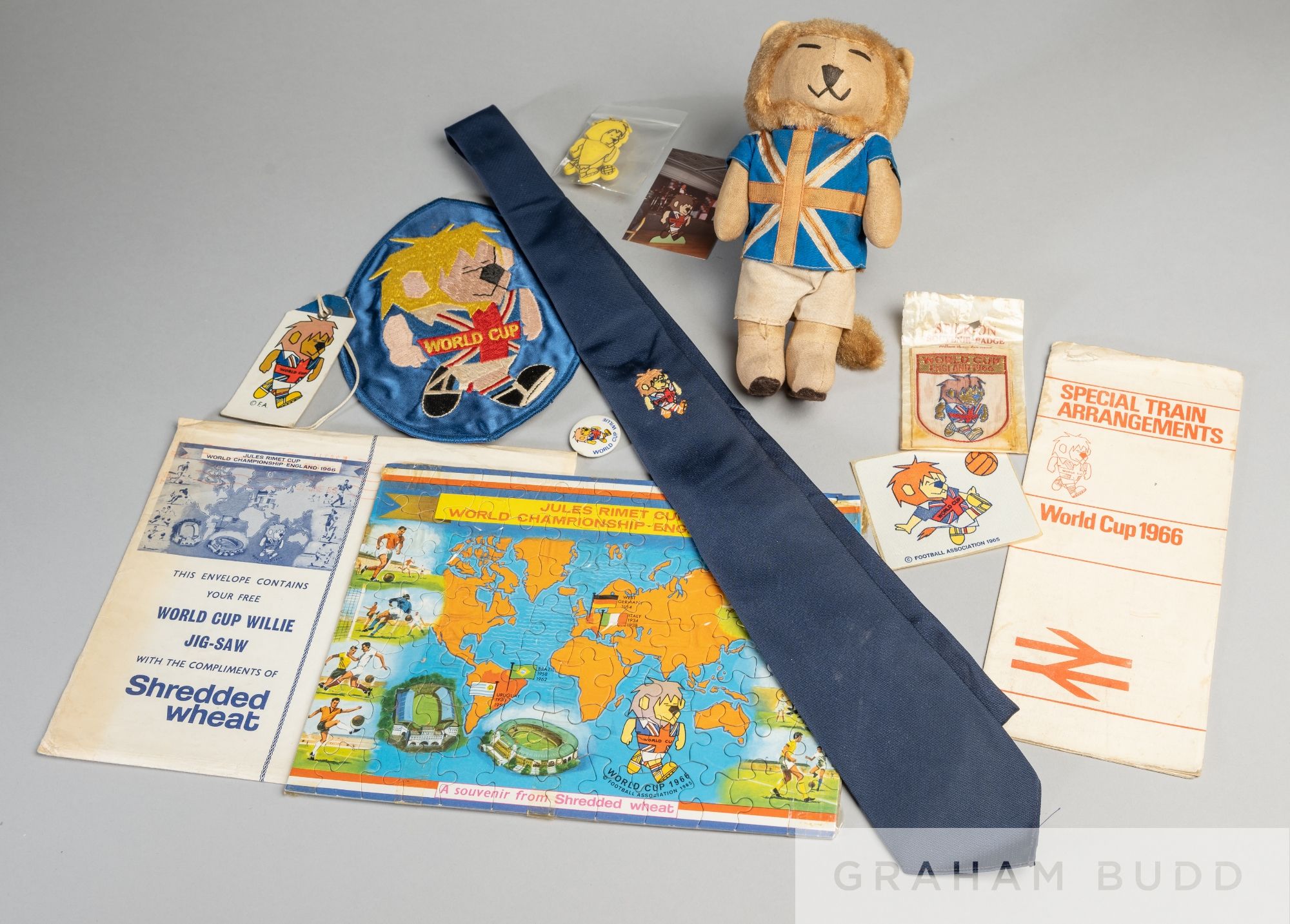 World Cup 1966 England selection re: World Cup Willie, includes original World Cup Willie cloth doll, 8in. high (note not plastic version), large World Cup Willie embroidered patch 7in., tie luggage label (2), patches/badges, lapel badge, plastic badge, plus rare Shredded Wheat World Cup jigsaw made up, complete with original envelope, British Rail time table with Willie to front, the vendor collected these personally in 1966 when he attended the World Cup, (qty)