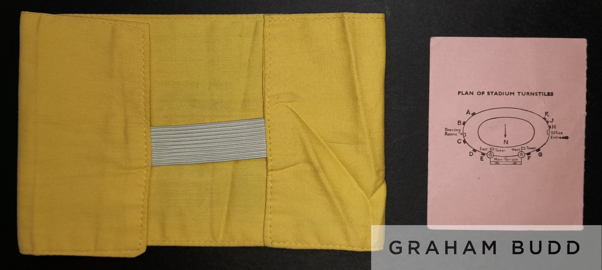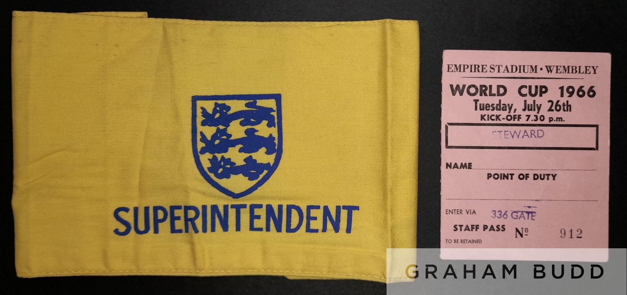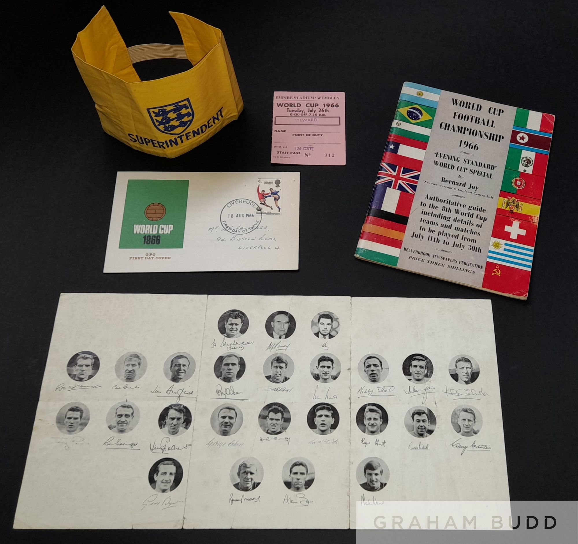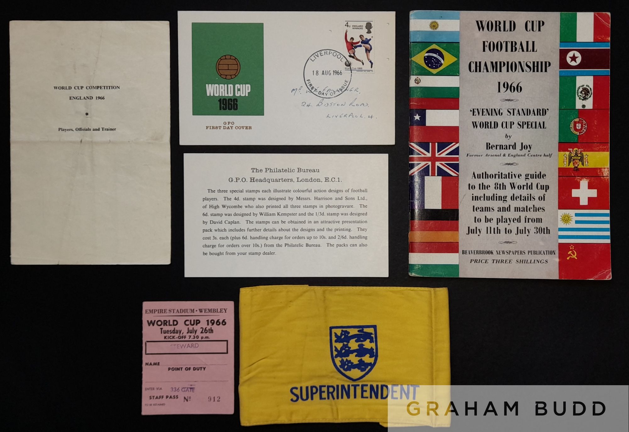England 1966 World Cup official superintendent armband in excellent condition, Stewards pass for England v Portugal Semi Final Tuesday July 26th 1966 along with GPO World Cup First Day Cover issued 18 AUG 1966, Players, Officials and Trainers pamphlet for England team along with authoritative guide to the 8th World Cup of teams and matches to be played from July 11th to July 30th
