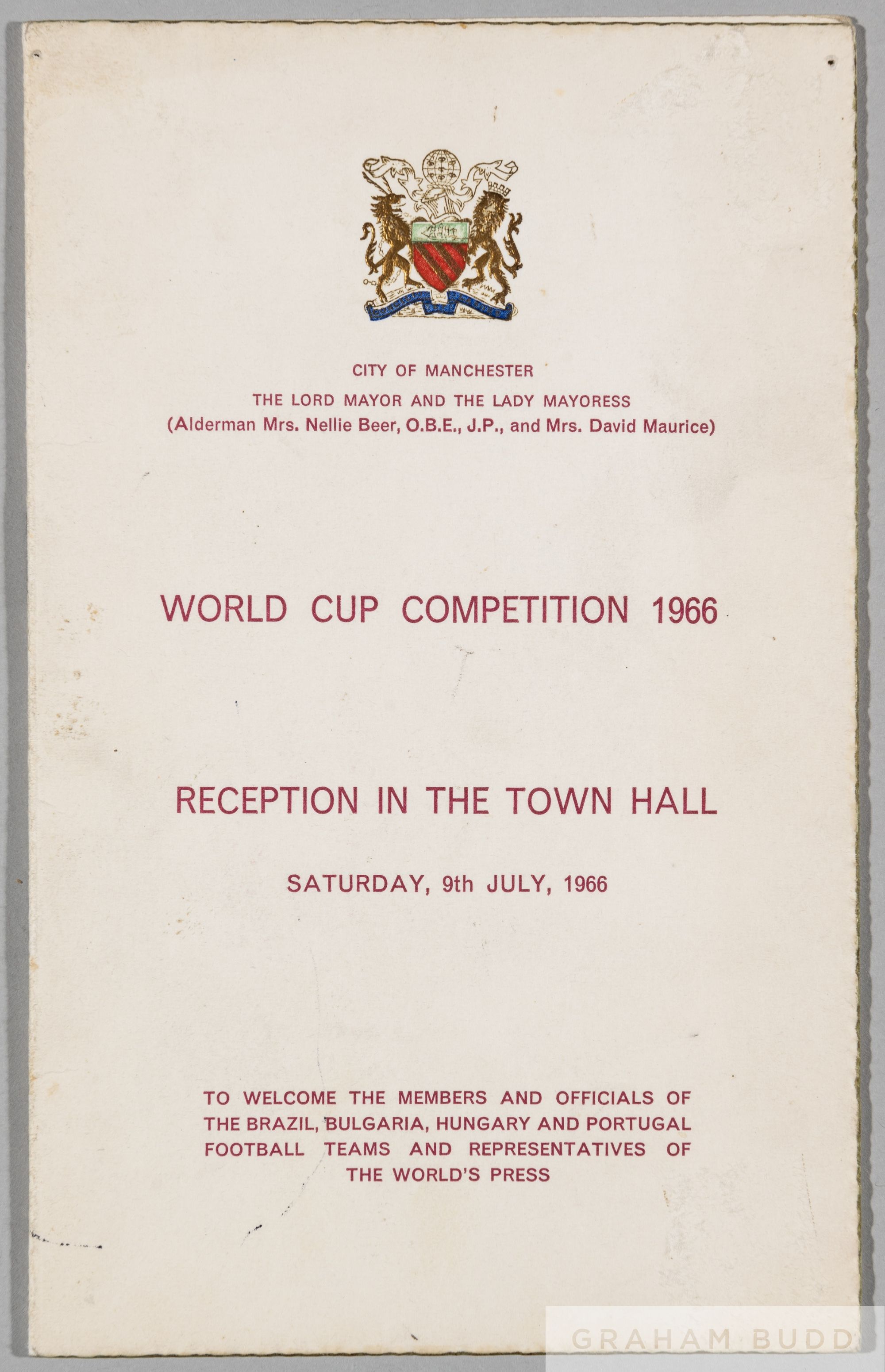 City of Manchester civic reception programme to welcome the 1966 World Cup participating nations playing matches in the north-west, comprising Brazil, Bulgaria, Hungary and Portugal, hosted by the Lord Mayor and Lady Mayoress, reasonably good condition