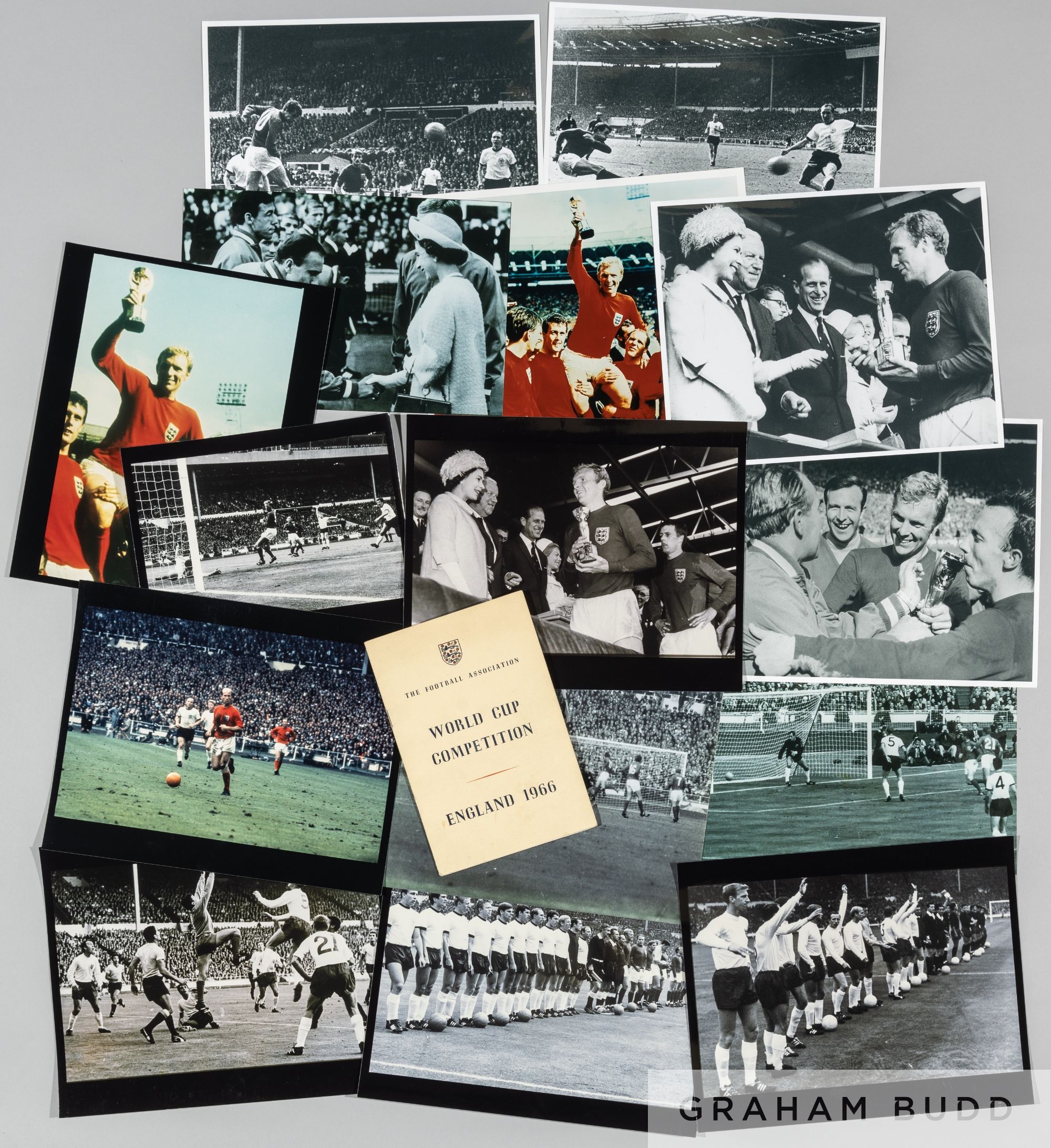 Football Association 1966 World Cup official itinerary, as issued to England players and officials, includes fold-out photographs of players with facsimile signatures, pen annotations, cream coloured covers a little grubby; sold together with 15 modern digitally reprinted photographs of the 1966 World Cup Final (16)