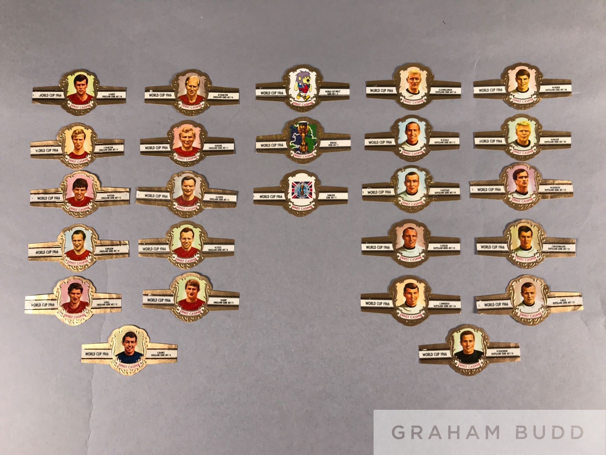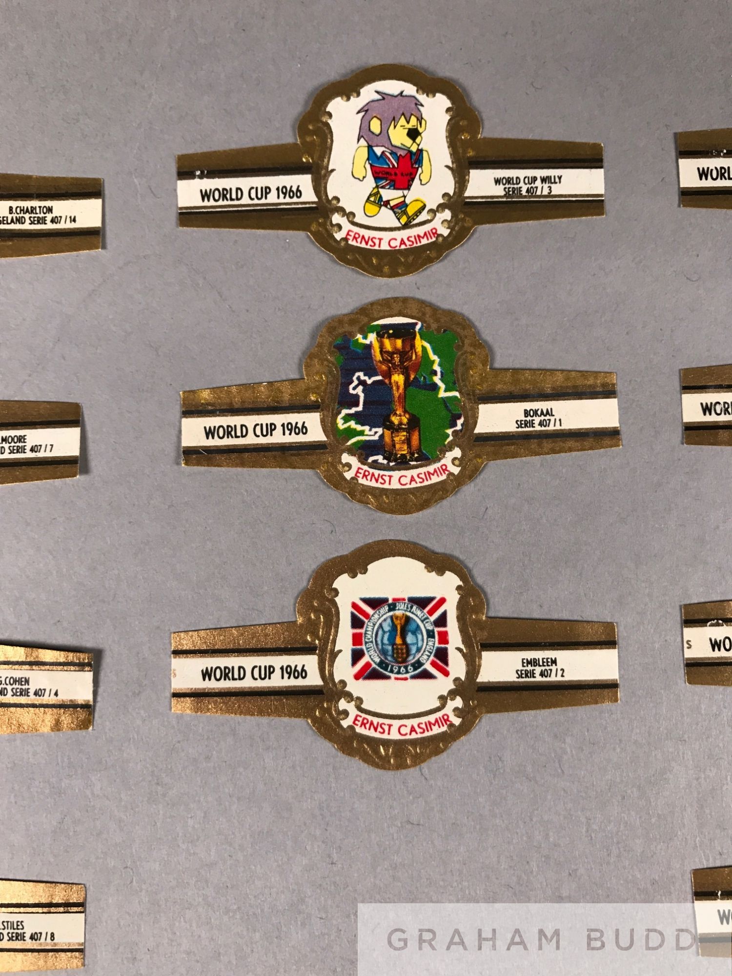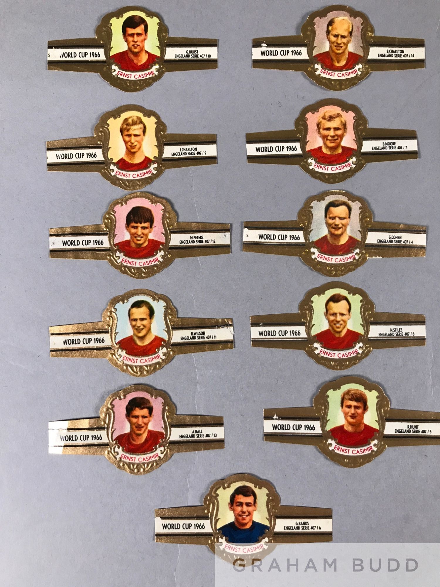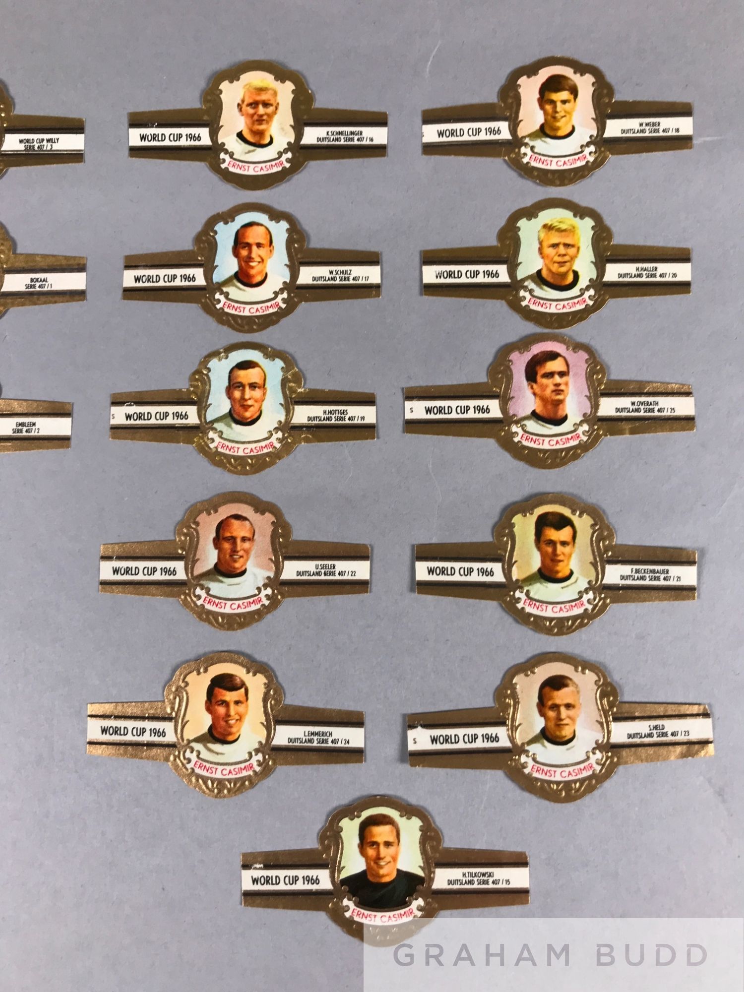 A set of 1966 World Cup England & Germany player profile Ernst Casimir cigar bands, comprising of 11 England players and 11 Germany players with three further World Cup 1966 band featuring logos and World Cup Willie, (25) Condition good, some with slight wear
