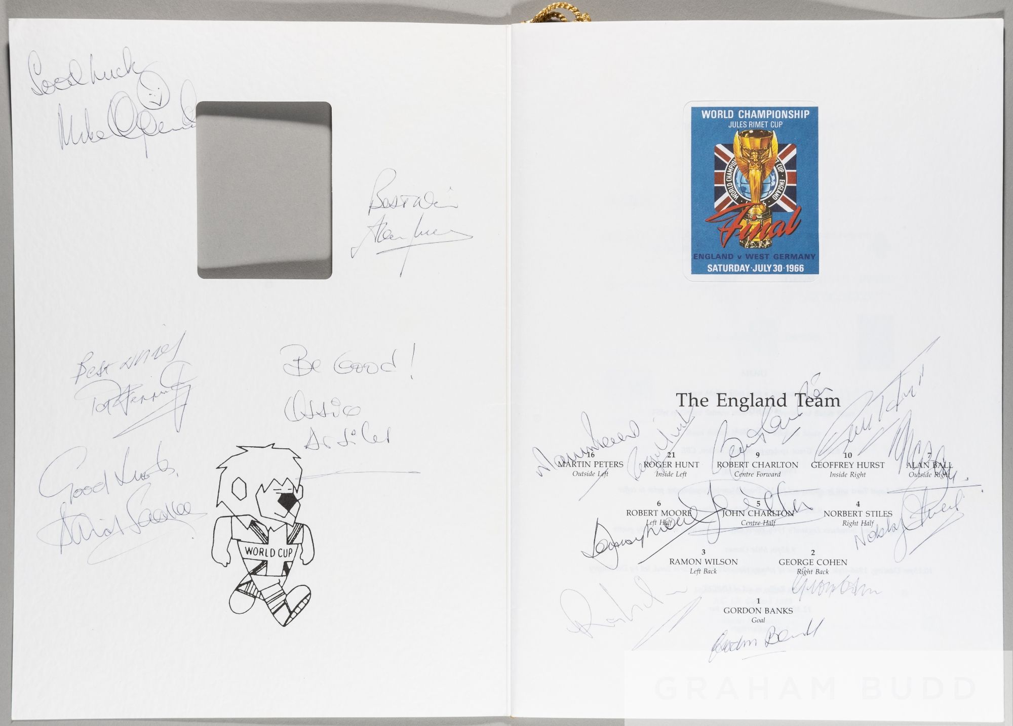 Signed World Cup England 1966 VIP menu with braid to spine for Gala dinner held in respect of 25th anniversary of World Cup Victory, hosted by Bobby Charlton, menu does not give venue or date, probably April 1991, beautifully signed by all 11 of team to team positions, additional signatures include Ardiles, Sadler, Jenners, etc.