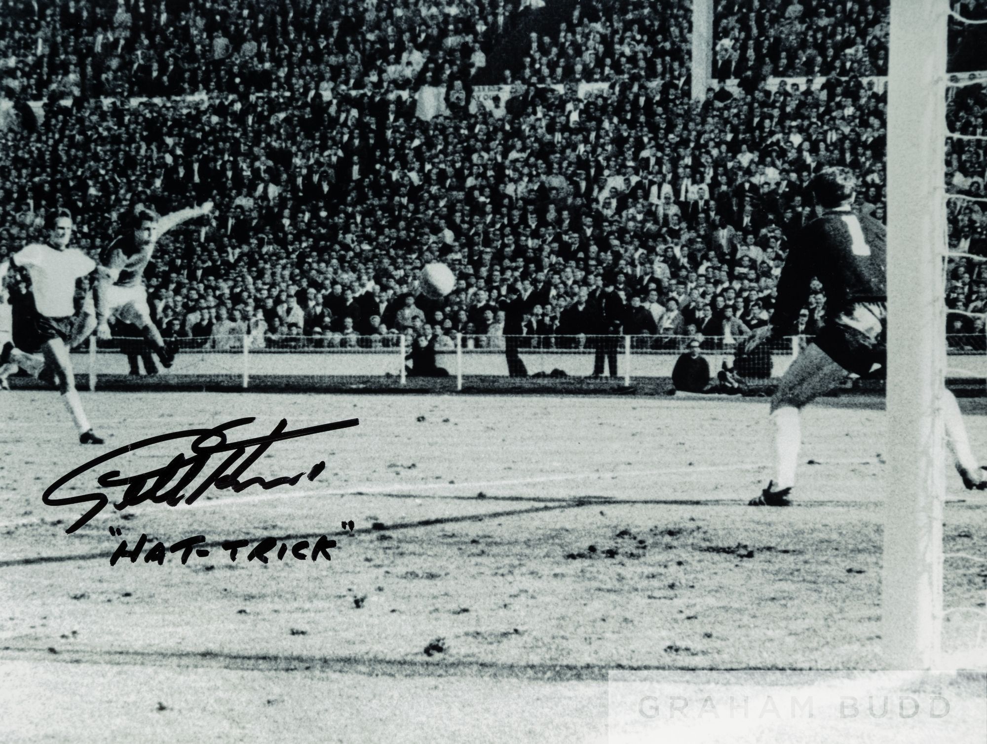 World Cup 1966 great visual angle of Geoff Hurst scoring his hat trick goal confirming England's win, signed by Geoff Hurst in black marker pen and adding the word 'Hat Trick', 16 by 12in.