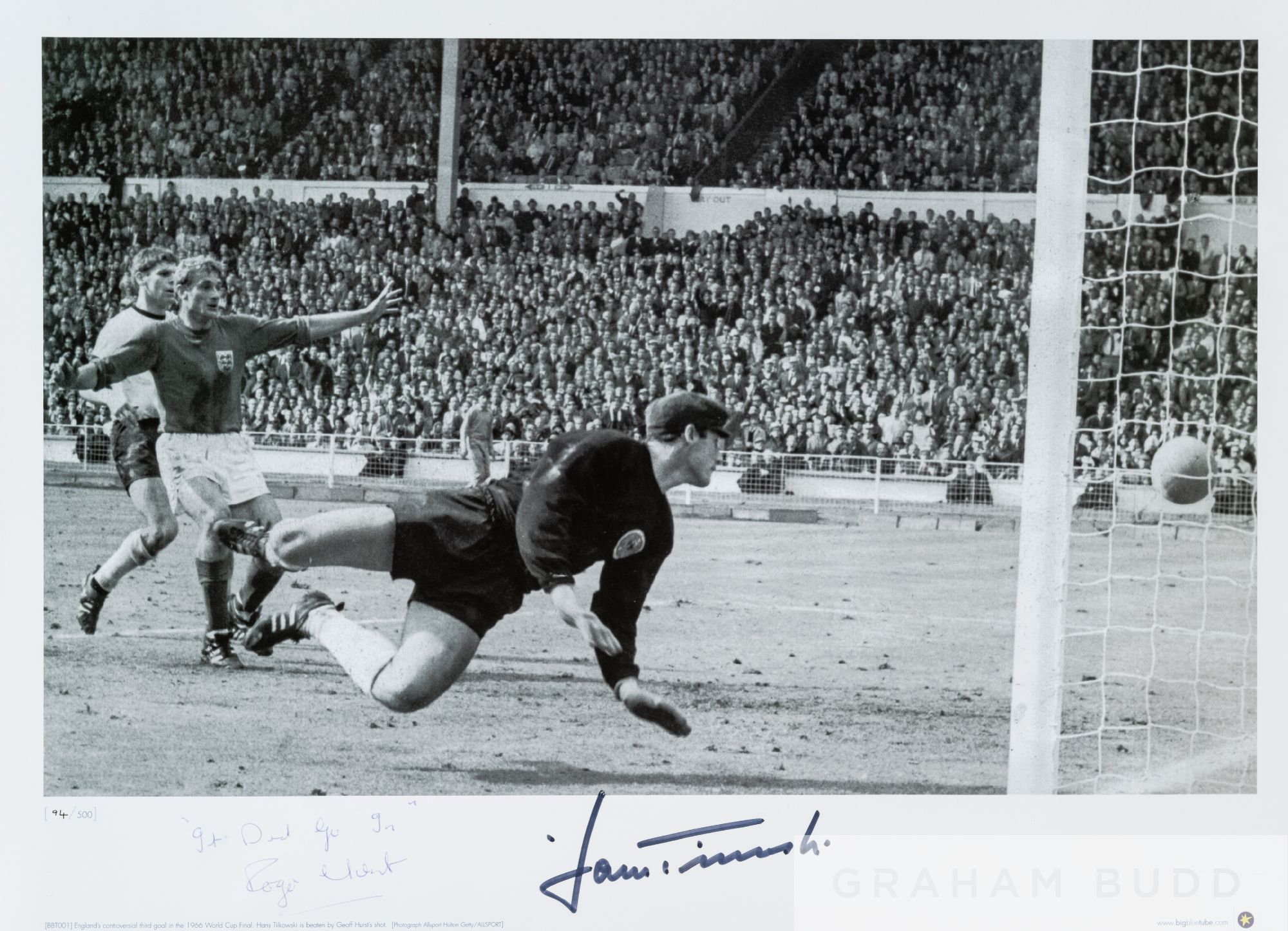 Rare picture of most controversial moment of 1966 World Cup final, signed by Hans Tilkowski and Roger Hunt confirming that 'it did go in', 20 by 12in., rolled