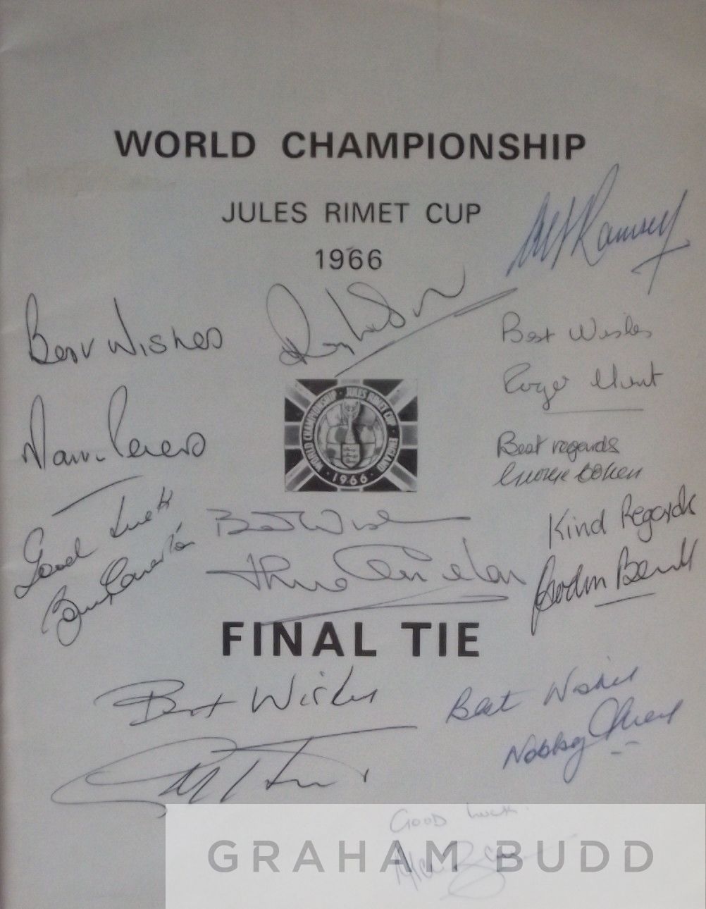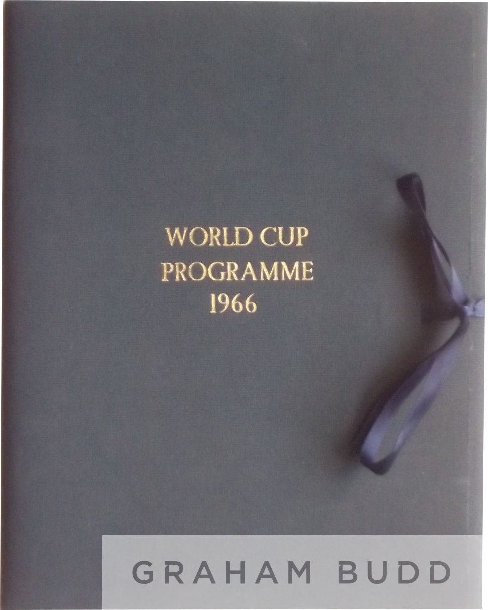 England 1966 World Cup Final programme being a 1970 reprint of the original encased in special edition gold lettered folder with ribbon tie, with the inside page having been signed by 10 of the team who beat West Germany 4-2 (aet) at Wembley along with the manager, Bobby Charlton, Ray Wilson, Alan Ball, Geoff Hurst, Martin Peters, George Cohen, Roger Hunt, Gordon Banks, Jack Charlton, Nobby Stiles and Sir Alf Ramsey (manager). Really nice addition to any autograph collection with no other writing in the programme, condition overall rated as 8/10, complete with COA