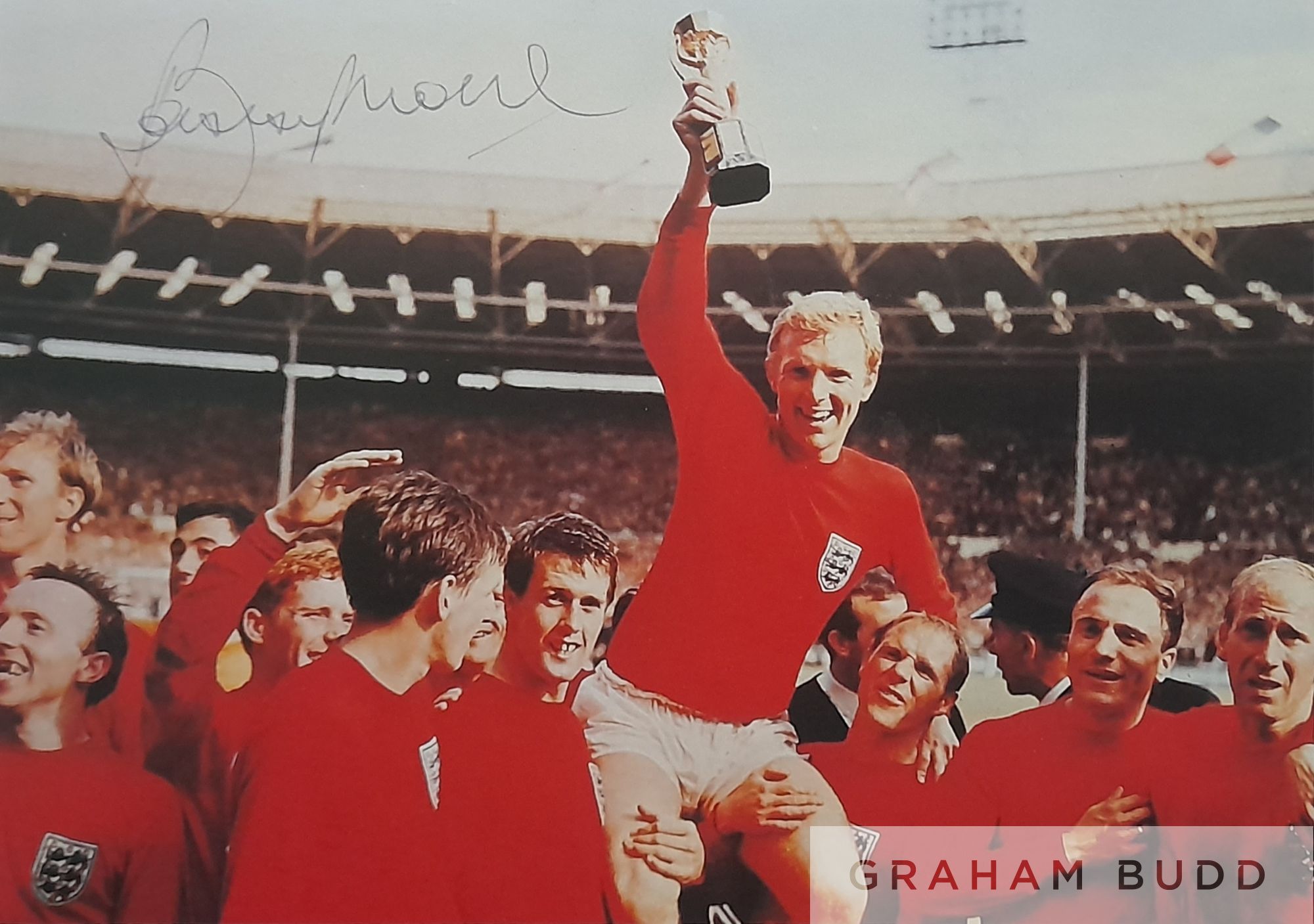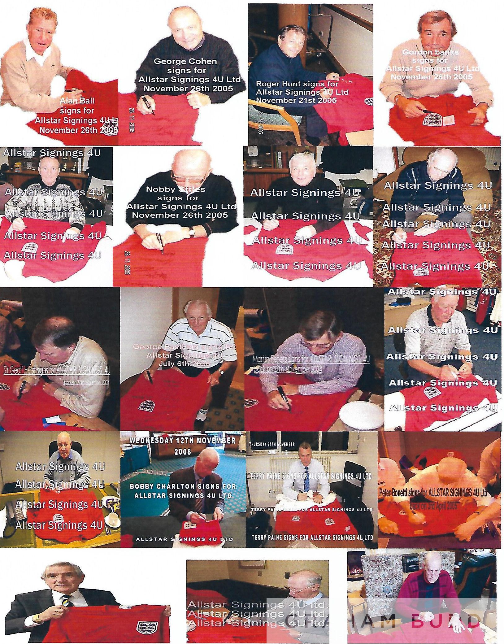 Rare collection of signatures all together now on one shirt considering thirteen of them are no longer with us, to compliment this shirt and complete the full squad there is a postcard signed by Bobby Moore and picture of manager Sir Alf Ramsey signed during England training for the tournament, comes with COA and photo proof of players signing