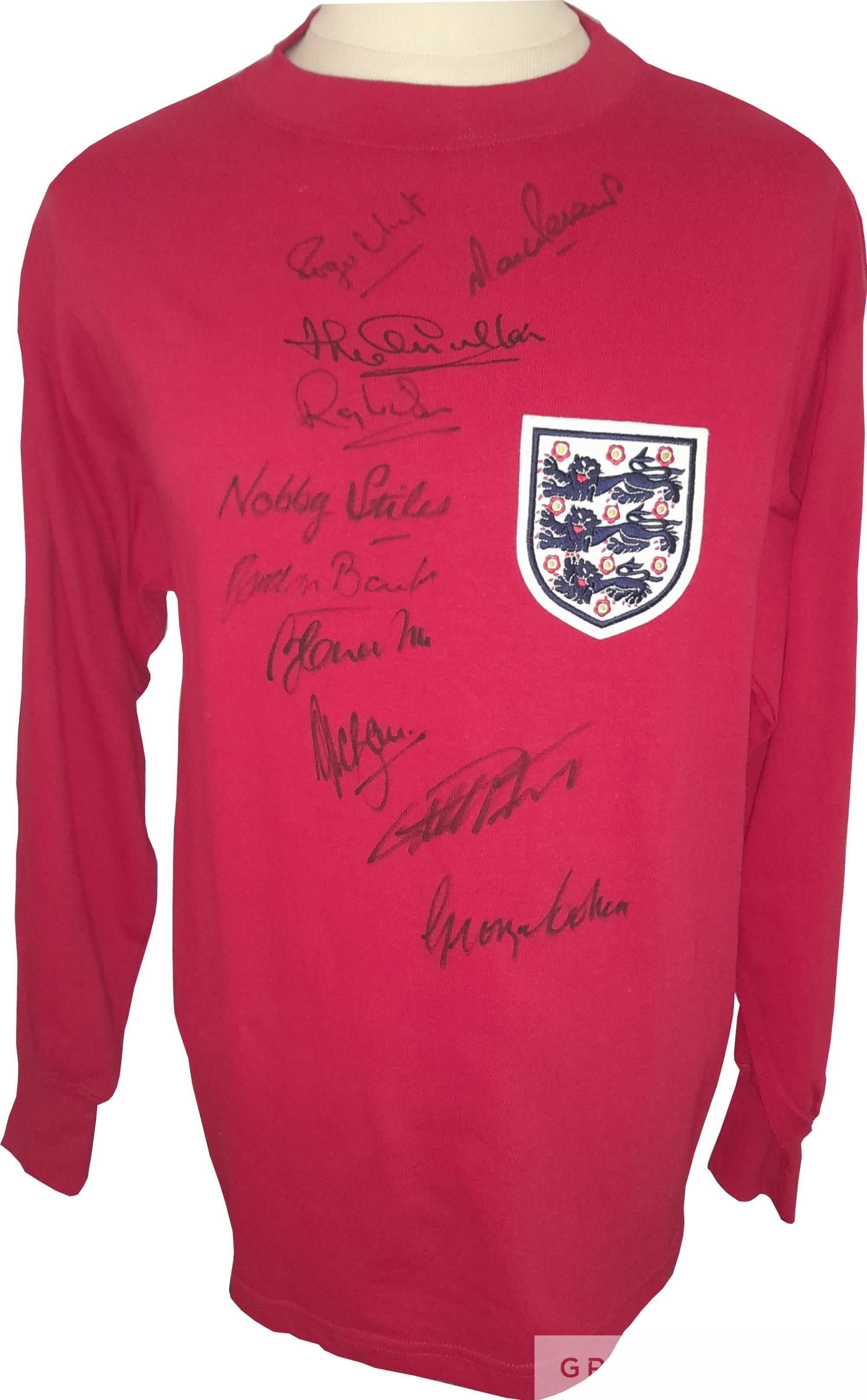 England 1966 World Cup Winners home shirt signed by 10 of the winning team, autographs on the shirt are Alan Ball, Geoff Hurst, Martin Peters, Gordon Banks, Roger Hunt, Jack Charlton, Nobby Stiles, Ray Wilson, George Cohen and Bobby Charlton with COA and photo proof