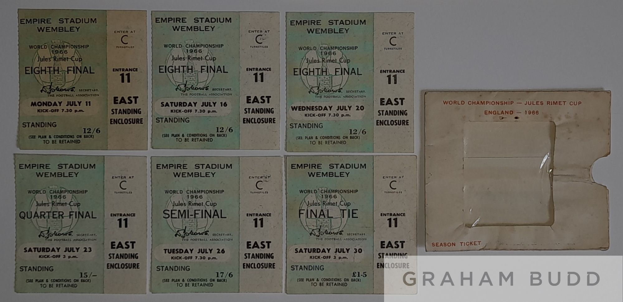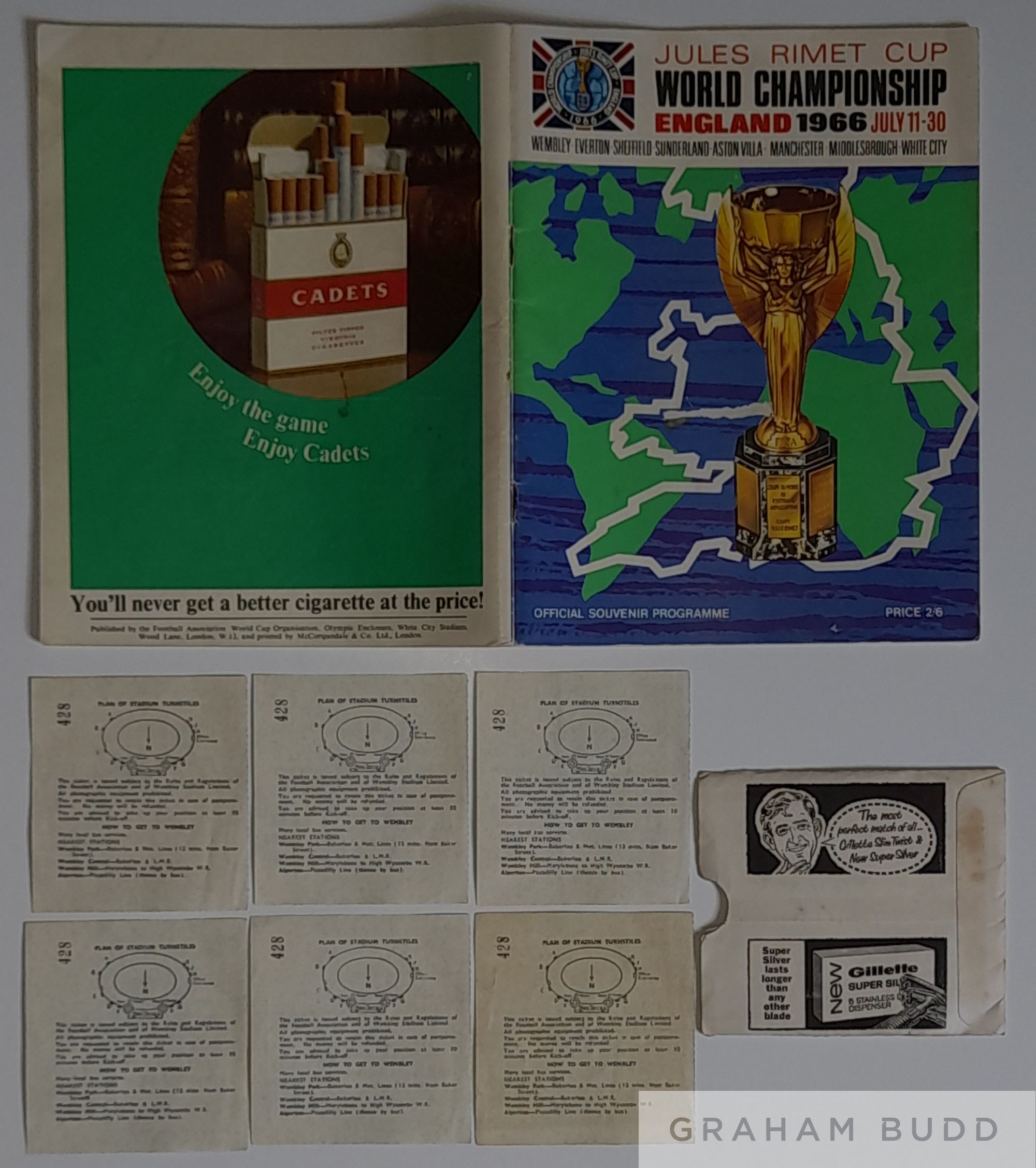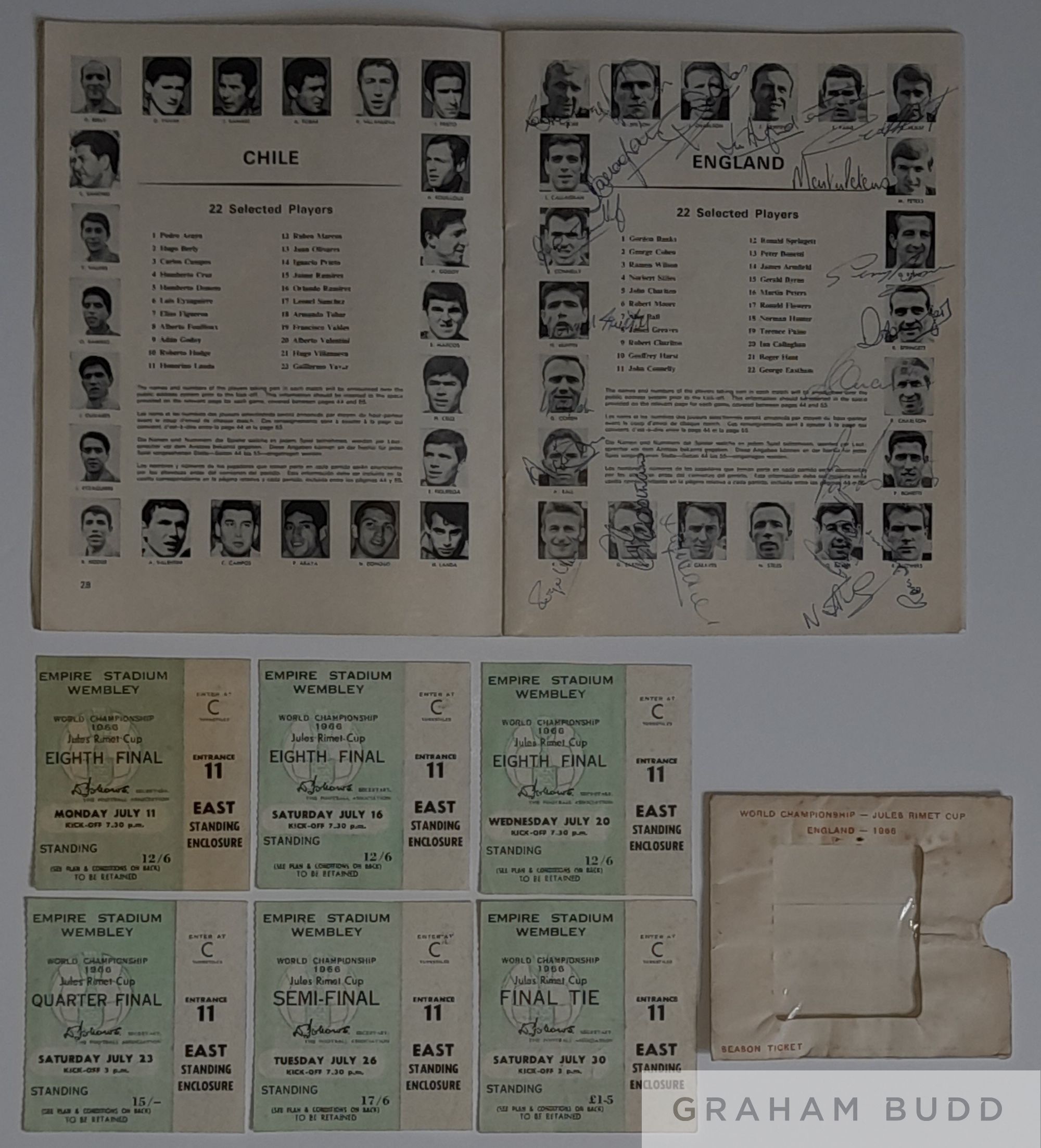 England 1966 World Cup tournament programme fully signed by the 22 man squad, set of six England match tickets plus ticket wallet that they were posted out in, tickets are matches at Wembley stadium, England's three group matches against Uruguay July 11th, Mexico July 16th & France July 20th, quarter-final against Argentina July 23rd, semi-final against Portugal July 26th and final against West Germany July 30th, as shown in action photos, programme comes with COA