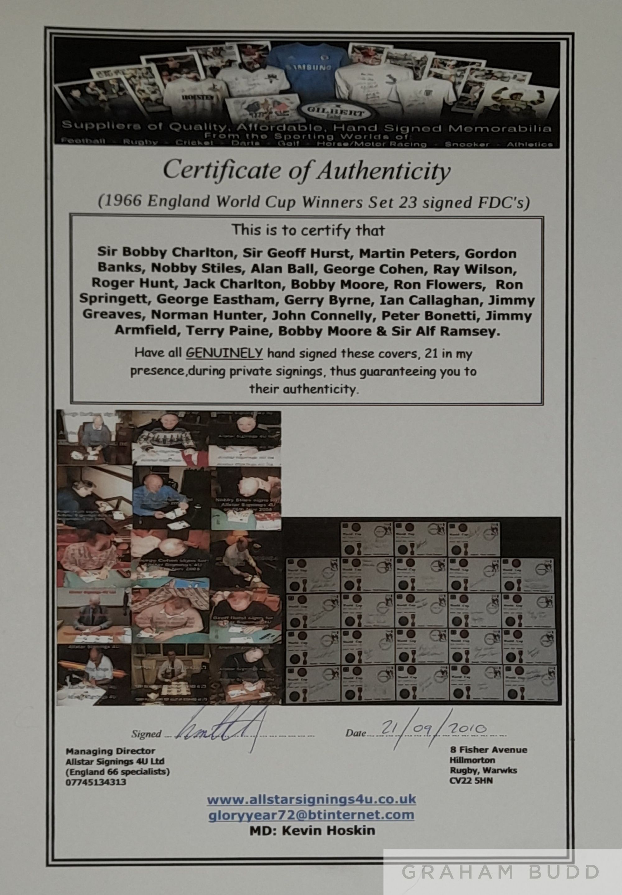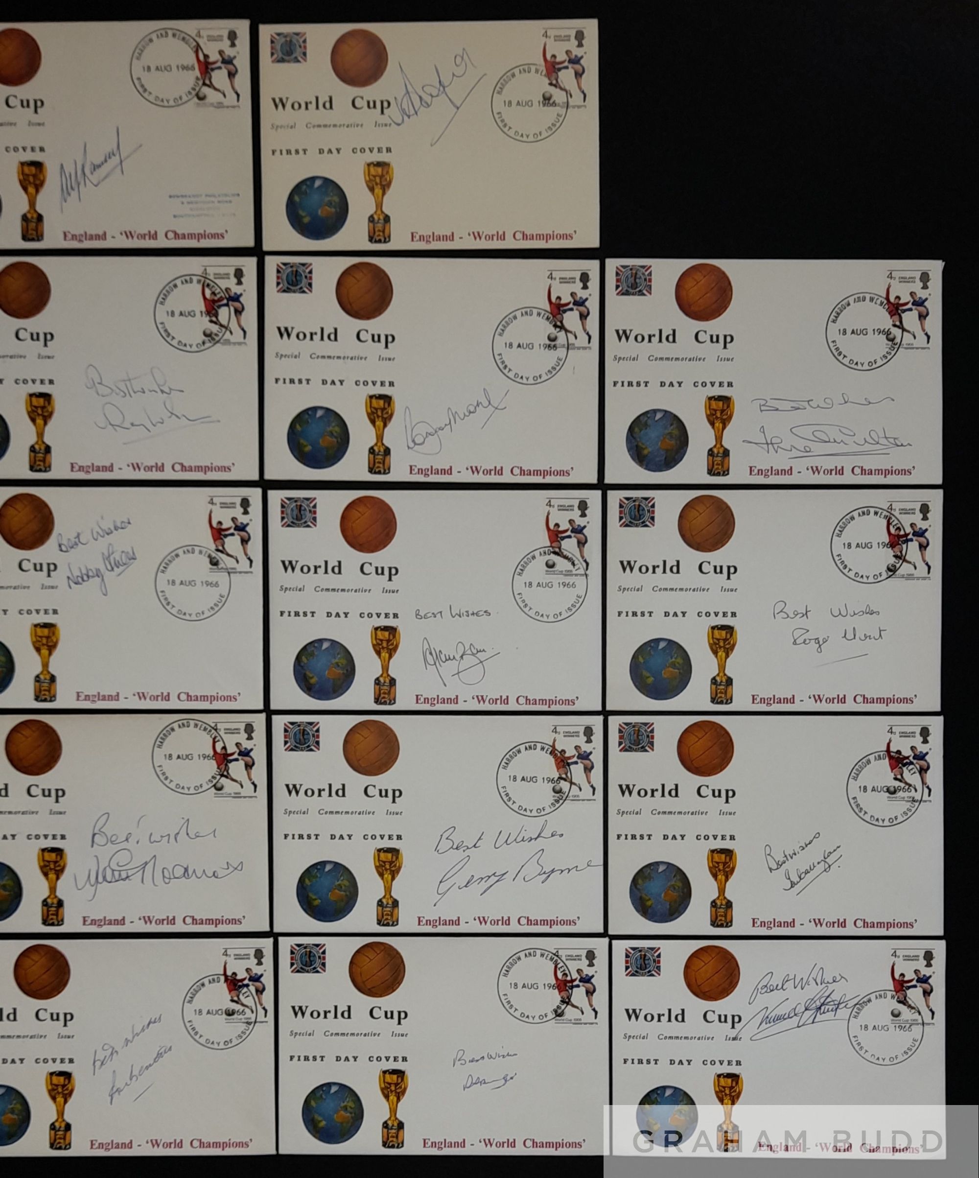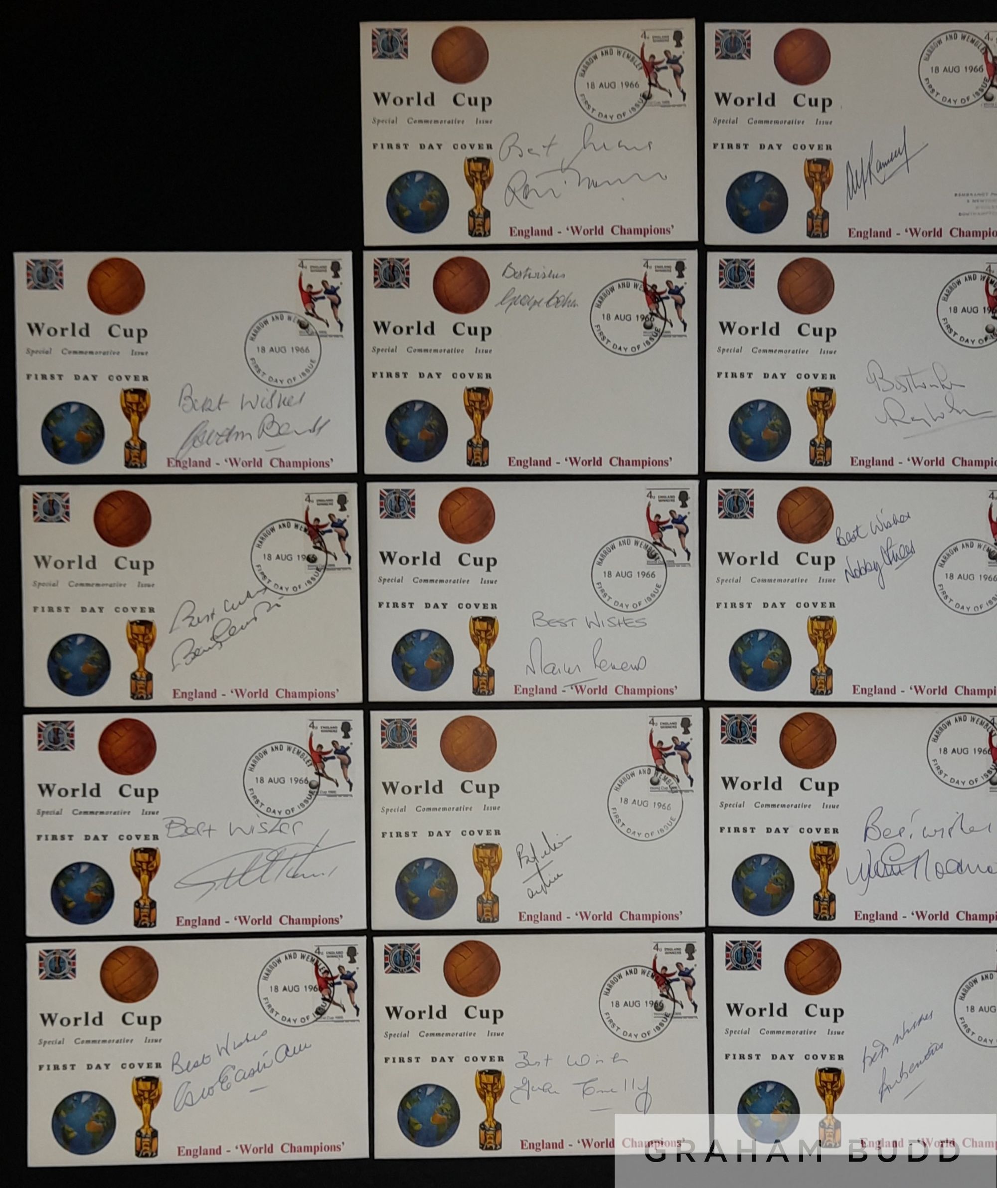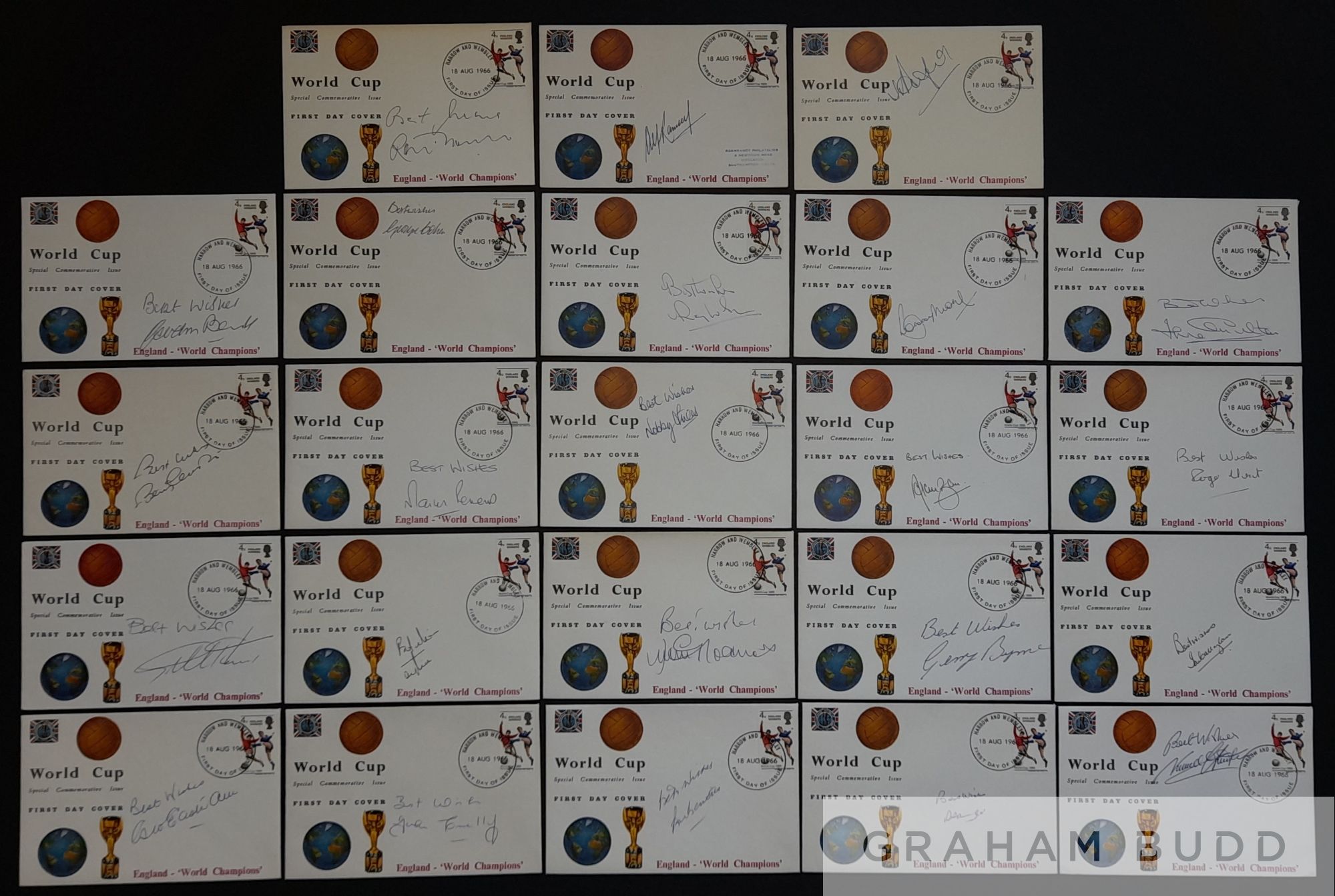 England 1966 World Cup Winners Full Set of 23 individually autographed, RARE Rembrandt Philatelic First Day Covers bearing the 4d England Winners Stamp and Franked Harrow and Wembley First Day of Issue 18 AUG 1966, signed by manager Sir Alf Ramsey, captain Bobby Moore along with Alan Ball, Geoff Hurst, Martin Peters, Gordon Banks, Roger Hunt, Jack Charlton, Nobby Stiles, Ray Wilson, George Cohen, Bobby Charlton, Ian Callaghan, Norman Hunter, John Connelly, Terry Paine, George Eastham, Gerry Byrne, Jimmy Greaves, Ron Springett, Peter Bonetti, Ron Flowers and Jimmy Armfield. Quite unique collection of covers with most players adding “Best Wishes” comes with COA and Photo Proof