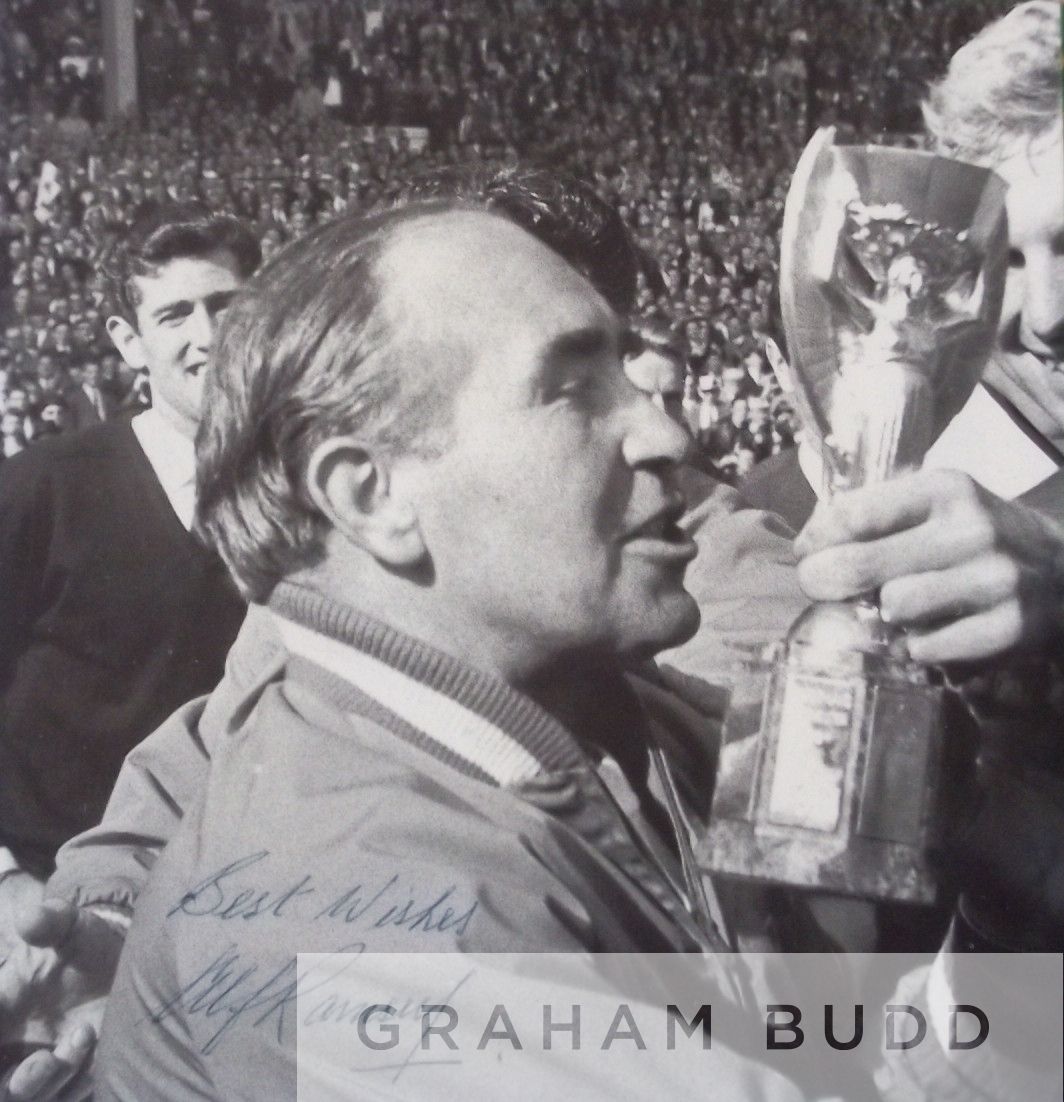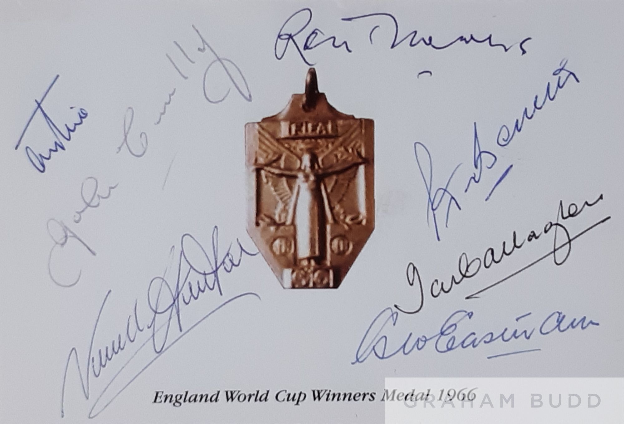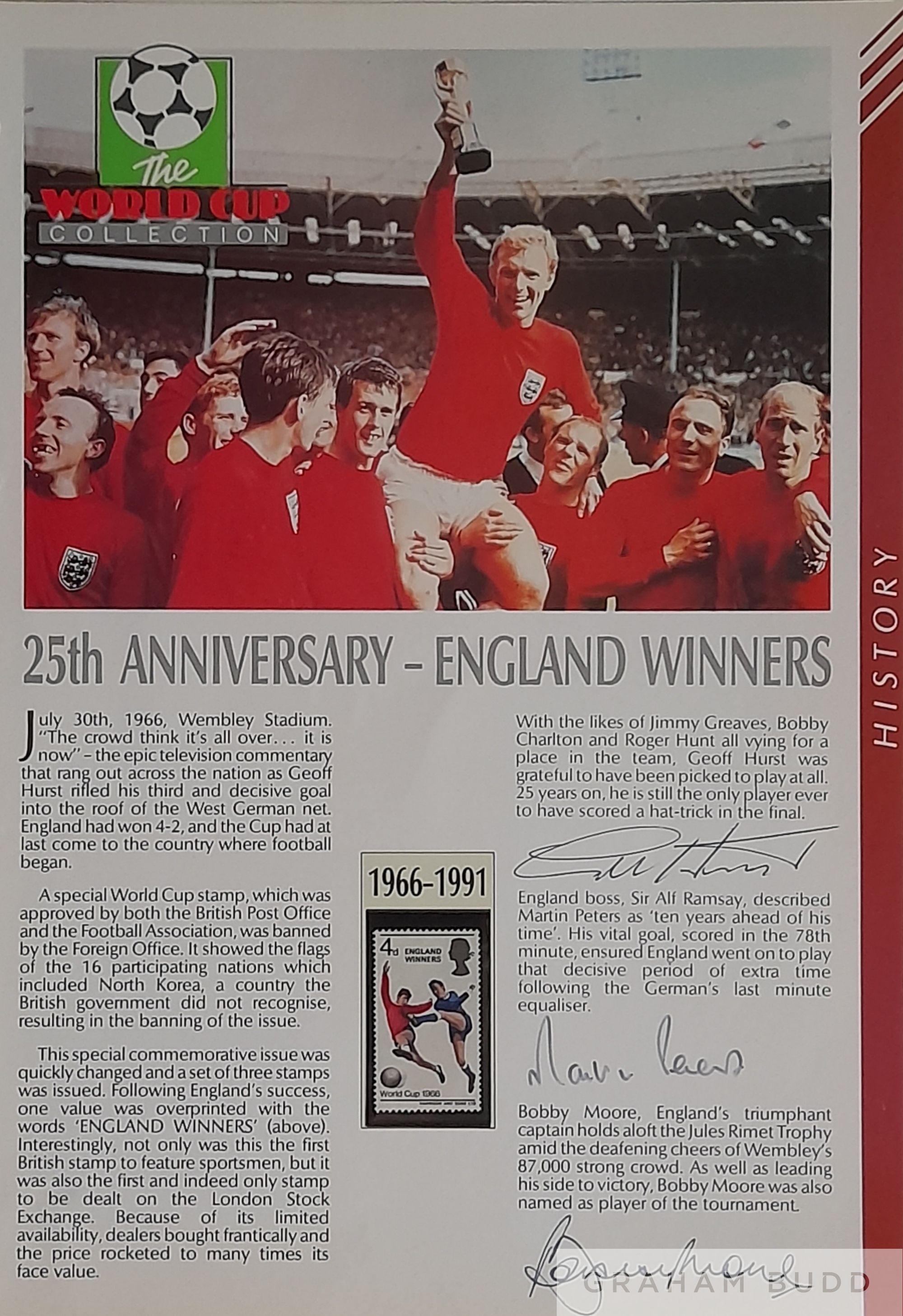 England 1966 World Cup Winning display captures the full 22 man squad plus manager featuring 12 signed World Cup Willie cards, Medal card signed by seven squad players, Sir Alf Ramsey signed picture along with World Cup masterfile sheet signed by three West Ham legends, The centrepiece showing the iconic image of Bobby with the Jules Rimet trophy held aloft by this team mates is signed by 10 who played in the final. Also displayed are World Cup mascot and Jules Rimet logo images along with list of the squad names. World Cup Willie cards signed by, Gordon Banks, Ray Wilson, Jack Charlton, George Cohen, Alan Ball, Bobby Charlton, Nobby Stiles, Roger Hunt, Jimmy Greaves, Gerry Byrne, Jimmy Armfield, Ron Springett, with Medal Card signed by, Terry Paine, John Connelly, Ron Flowers, Norman Hunter, Peter Bonetti, Ian Callaghan, George Eastham leaving the World Cup Masterfile signed by, Bobby Moore, Geoff Hurst & Martin Peters that has short write up of the 66 final history, with 4d England winners stamp mounted in protective sleeve. Overall this display measures 31.5 by 24.5in., comes complete with our company COA which includes photo proofs.