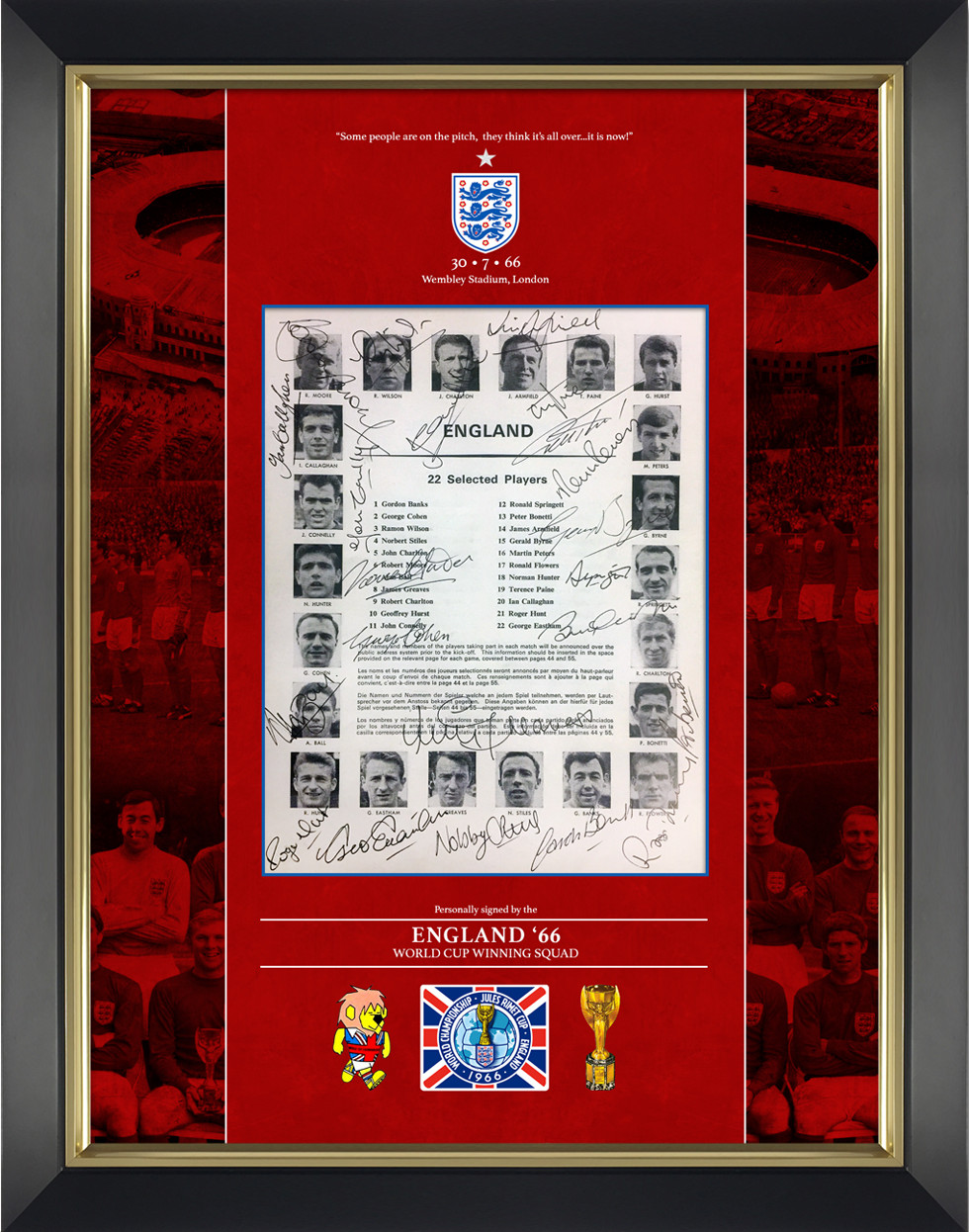 England 1966 World Cup winning team signed and stylishly framed final programme page display featuring the autographs of the full 22 man squad, Alan Ball, Geoff Hurst, Martin Peters, Gordon Banks, Roger Hunt, Jack Charlton, Nobby Stiles, Ray Wilson, George Cohen, Bobby Charlton, Ian Callaghan, Norman Hunter, John Connelly, Terry Paine, George Eastham, Gerry Byrne, Jimmy Greaves, Ron Springett, Peter Bonetti, Ron Flowers, Jimmy Armfield