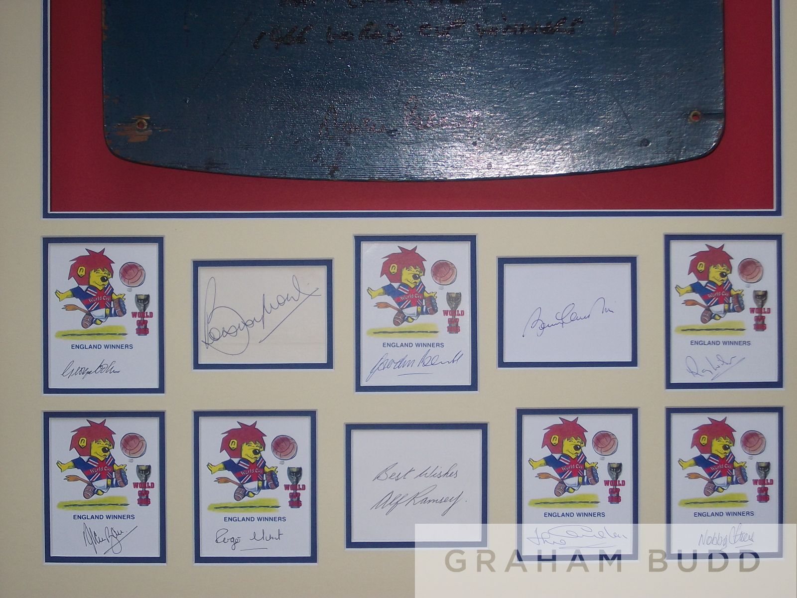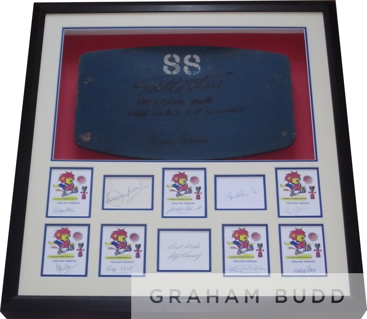 England 1966 World Cup Display features an official seat taken from Wembley Stadium (with official certificate) signed by the two goal scorers Geoff Hurst & Martin Peters with added inscription "Hat Trick Hero 1966 World Cup Winners" by Geoff Hurst, along with seven World Cup Willie cards signed by Ray Wilson, Roger Hunt, Nobby Stiles, Gordon Banks, Jack Charlton, Alan Ball and George Cohen alongside the autographs of Bobby Charlton, Bobby Moore and manager Sir Alf Ramsey on plain card/paper. Frame measures 27 by 24.5 by 2.5in. deep, comes complete with COA incorporating photo proof of the seat signing along with the World Cup Willie cards.