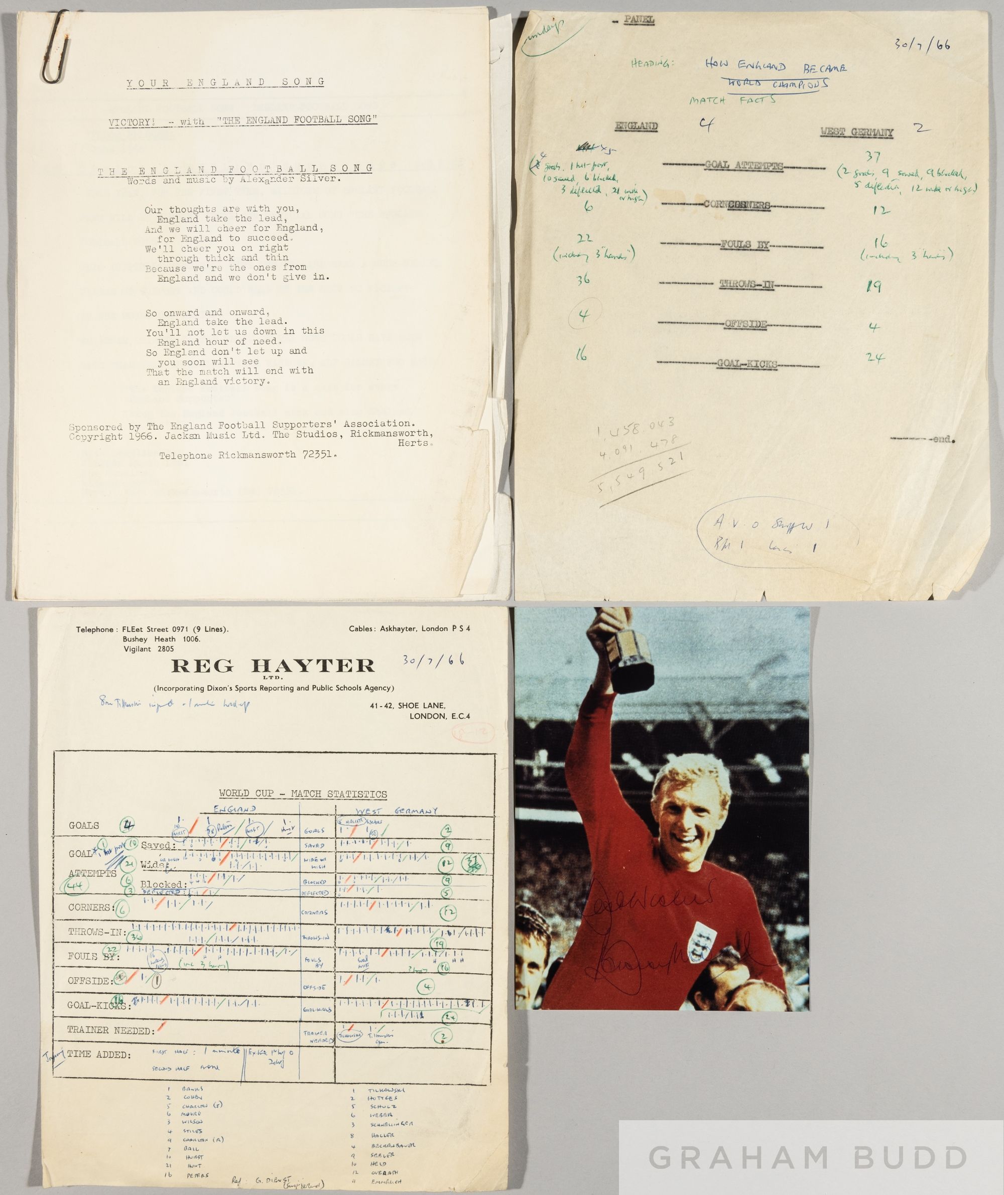 Bobby Moore signed colour photograph, the famous image of the England 1966 World Cup winning captain holding the Jules Rimet Trophy aloft; sold together with two original documents from the press box on Final day both annotated with statistical information; also three pages of typescript correspondence between the England Supporters' Association and the F.A. regarding a 1966 song/record (3)