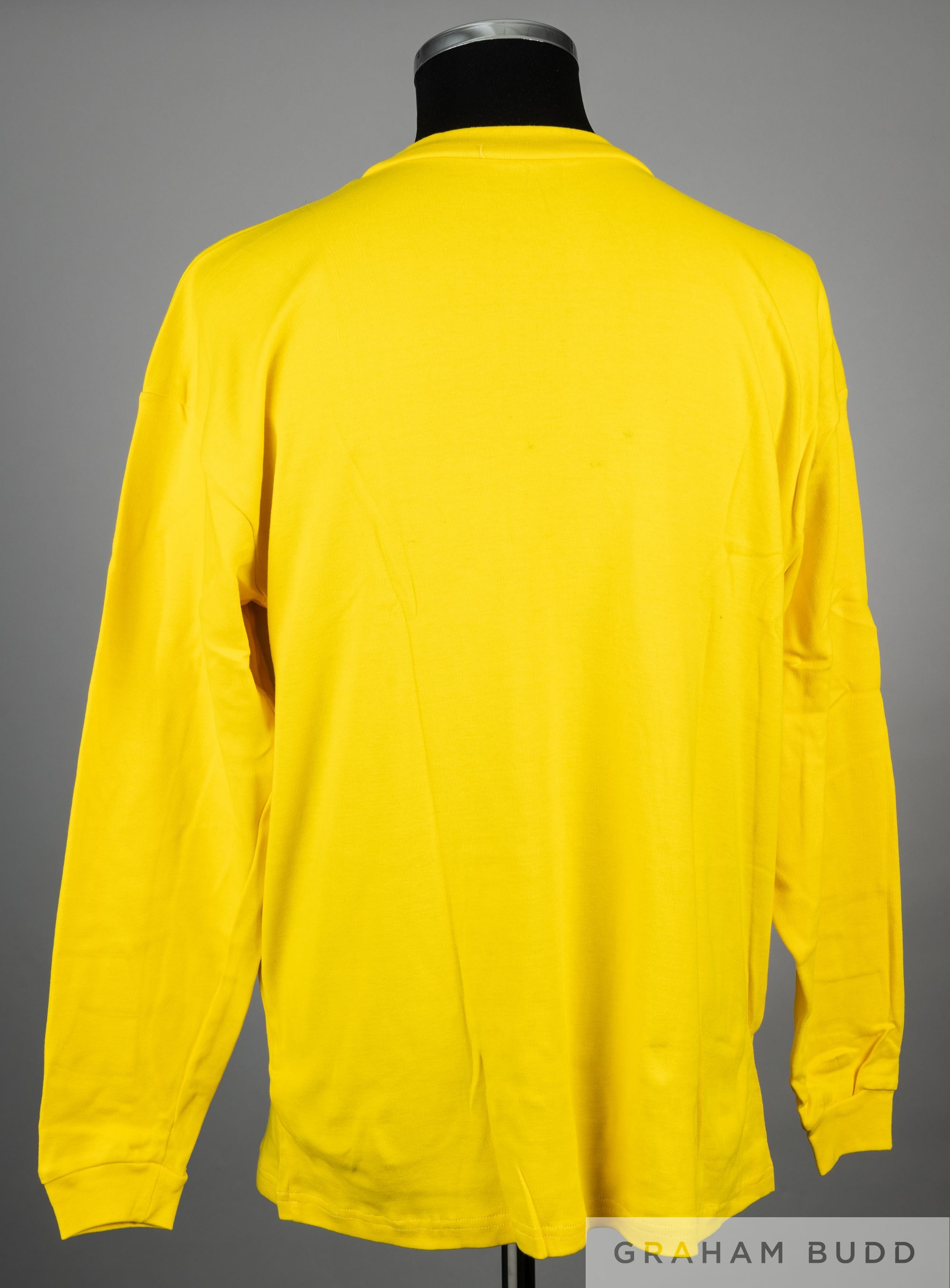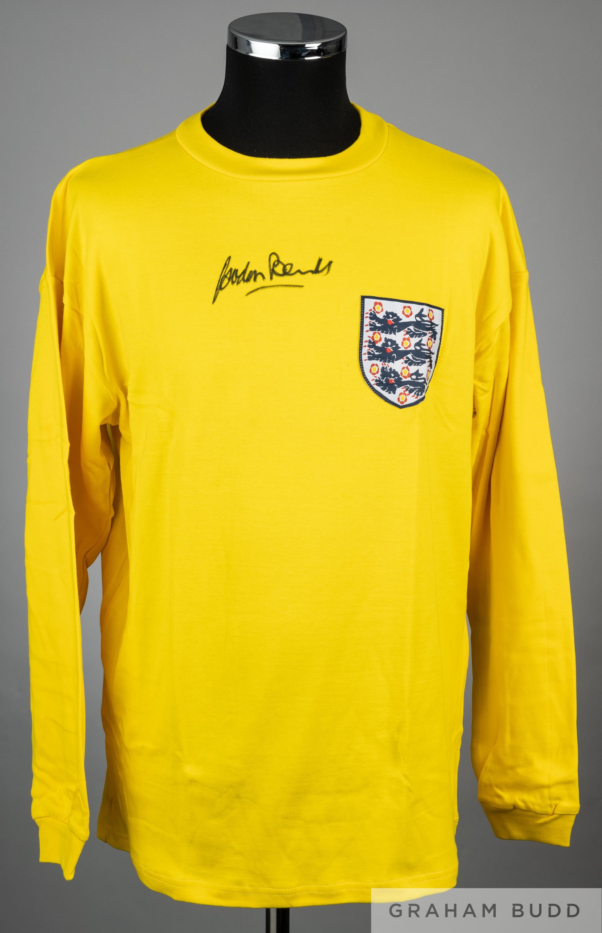 Gordon Banks signed yellow England replica goalkeeping jersey, Chanterie, long-sleeved bearing England three lion crest, signed in black marker pen, size L, with Sporting Legends COA Condition as New not worn.
