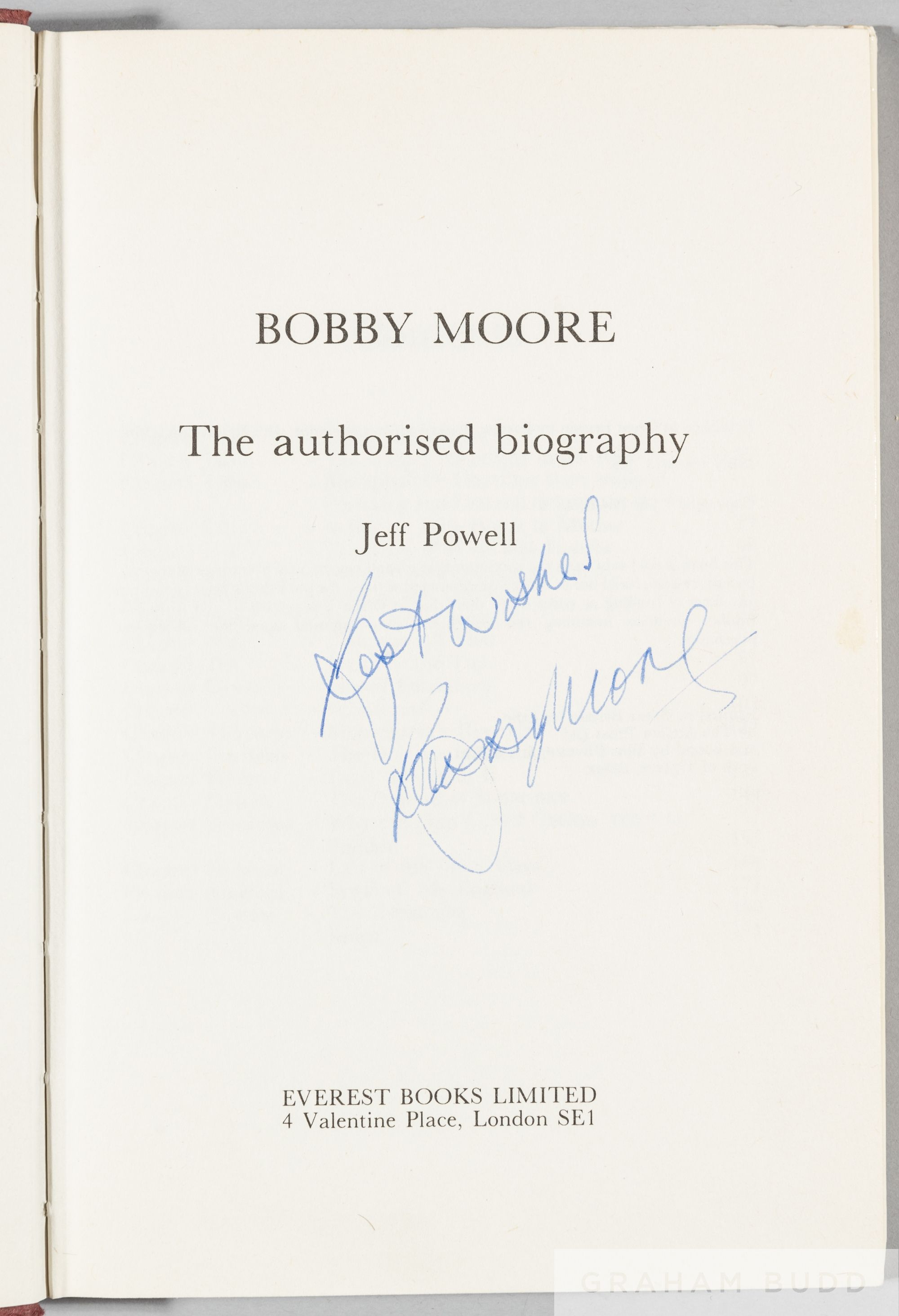 Bobby Moore biography by Jeff Powell, signed by 21 members of the England 1966 squad, lacking Hunter and Paine, hardback with d/j, 192-page, signed in pen on frontispiece in ink Condition fair to good with wear to d/j edge, slight discolouration of d/j