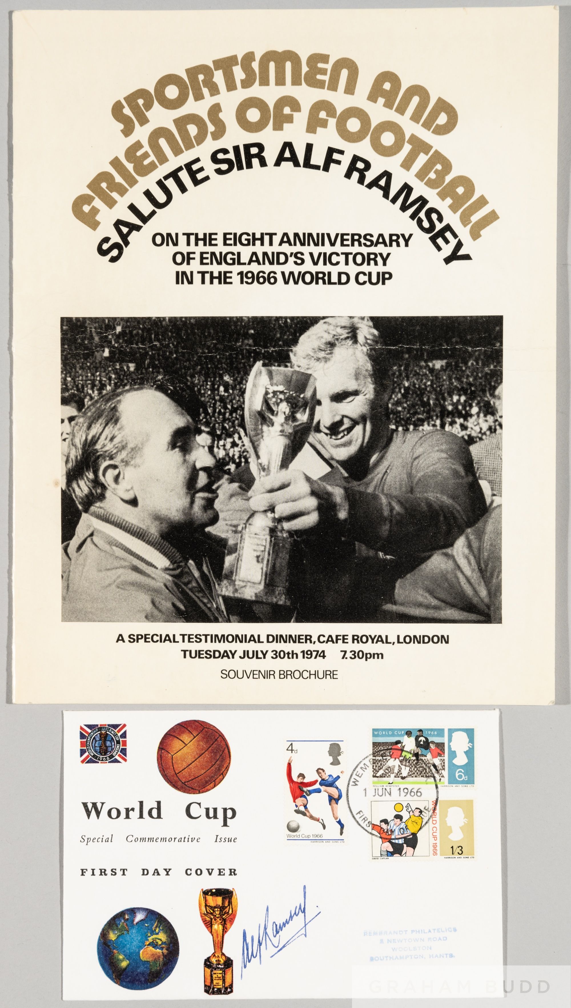 1966 World Cup First Day Cover signed by England manager Alf Ramsey, signature in blue ink, fine condition; sold with a souvenir brochure for a Sir Alf Ramsey Salute Night on 8th anniversary of the World Cup win, 30th July 1974 (2)