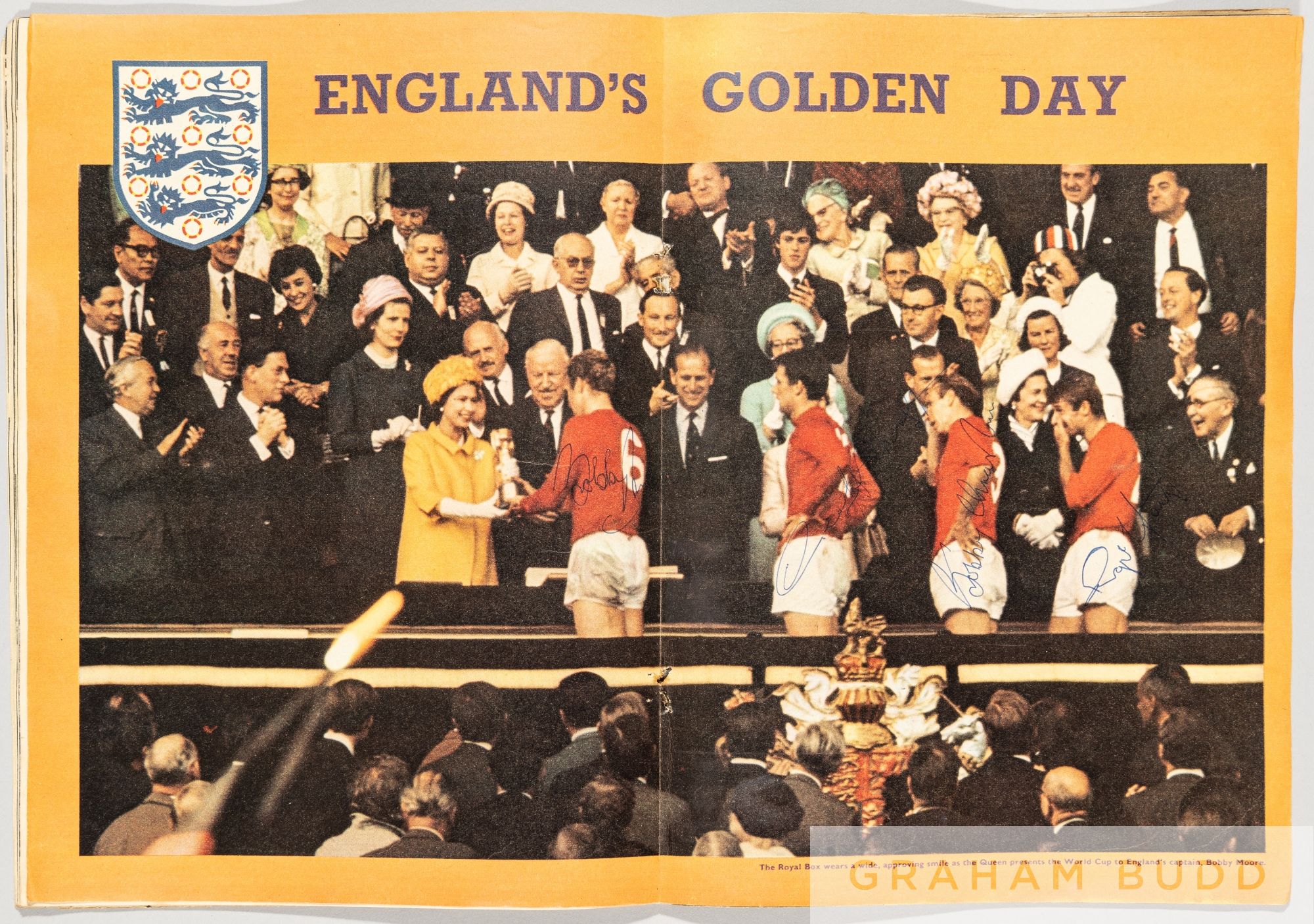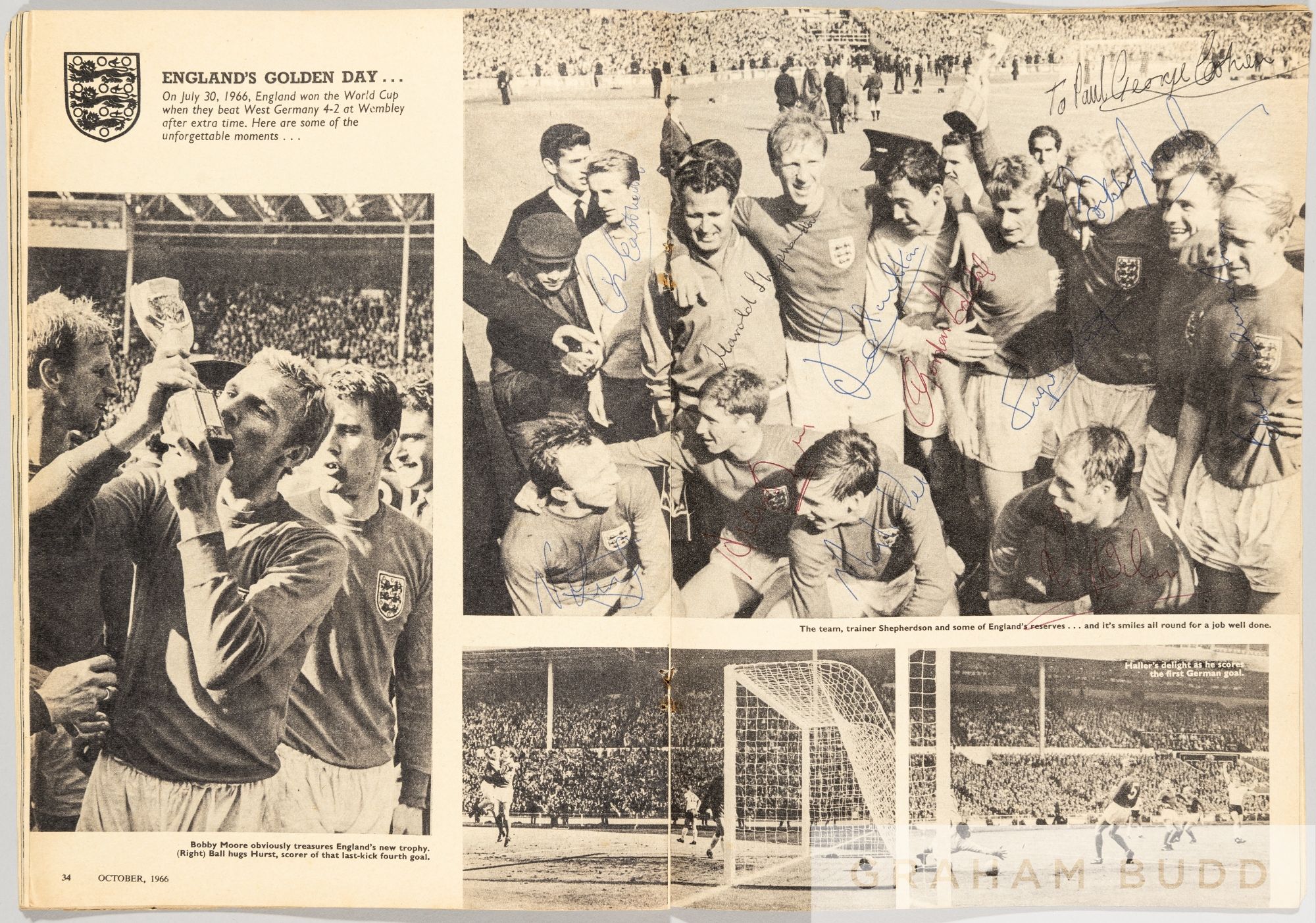 Charles Buchan's Football Monthly magazine, October 1966, fully signed by the England team, 64-page magazine, with centre colour page featuring Bobby Moore being presented with the World Cup Jules Rimet trophy from the late Queen Elizabeth II, signed by Moore, Hurst, B Charlton & Hunt, the overleaf a b&w team photo signed by 10 of the players (lacking Hunt) but including the trainer Shepherdson and reserve Eastham, the Cohen autograph with dedication "To Paul" Condition fair to good with wear to cover, slight split to spine on lower edge, cover with page edge wear, centre page loose from staples, slight yellowing to pages