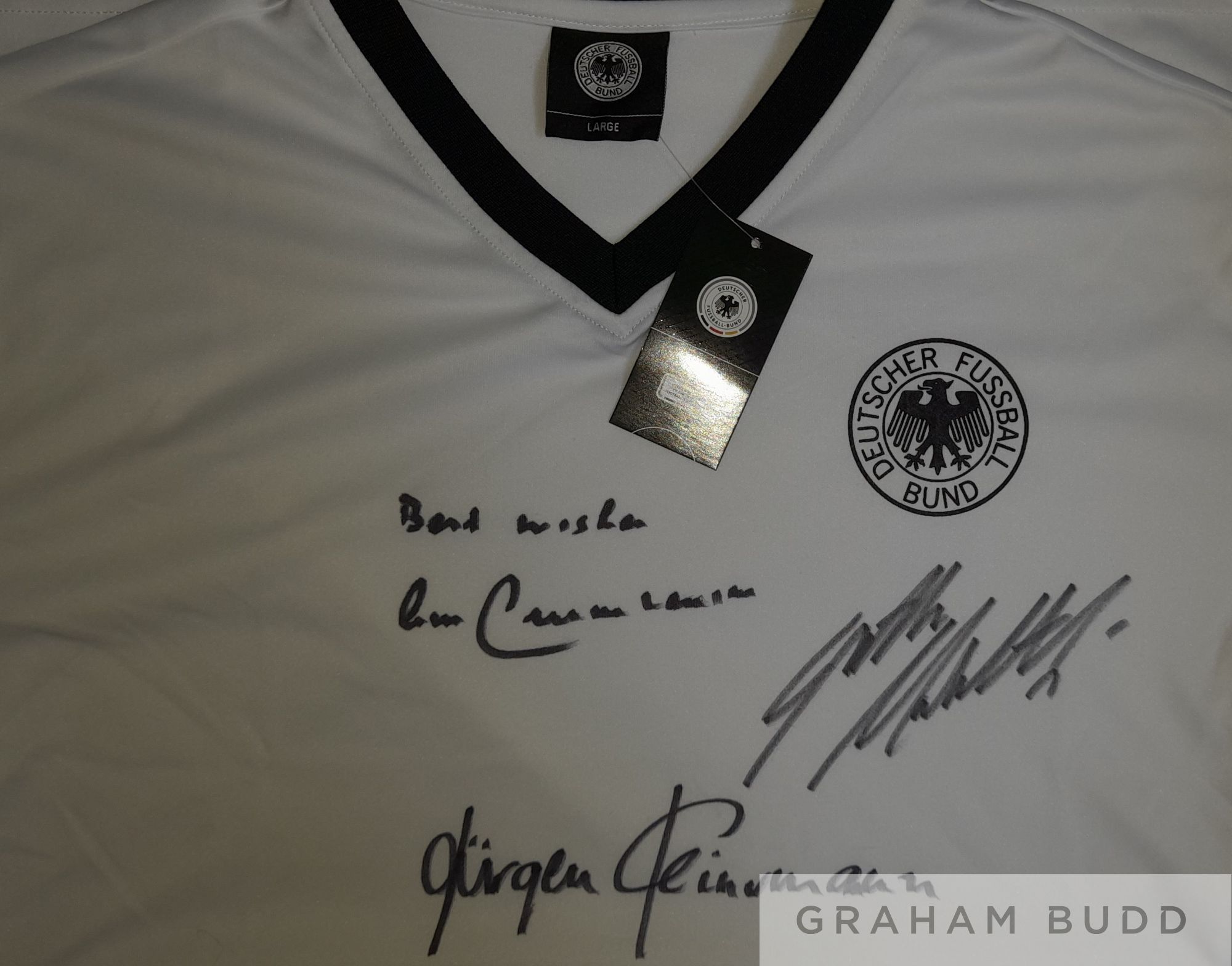 West Germany 1970 official German FA merchandise brand new shirt with tags still attached signed by three German legends, Franz Beckenbauer who played in 1966, 1970 and 1974 World Cup tournaments, winning as player and later as manager also.