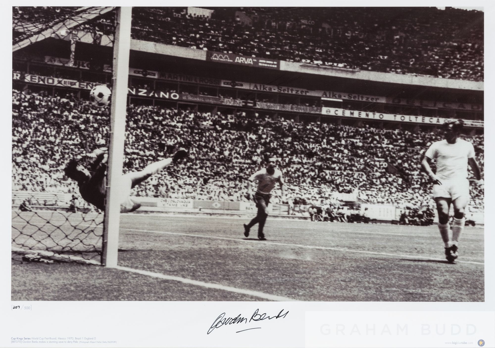 Big Blue Tube Cup Kings b&w print 1970 World Cup signed by Gordon Banks, featuring Gordon Banks saving an attempt on goal by Pele, signed in black marker pen with legend, Limited Edition 207 of 500, mounted with cellophane wrapper, 48 by 67cm.