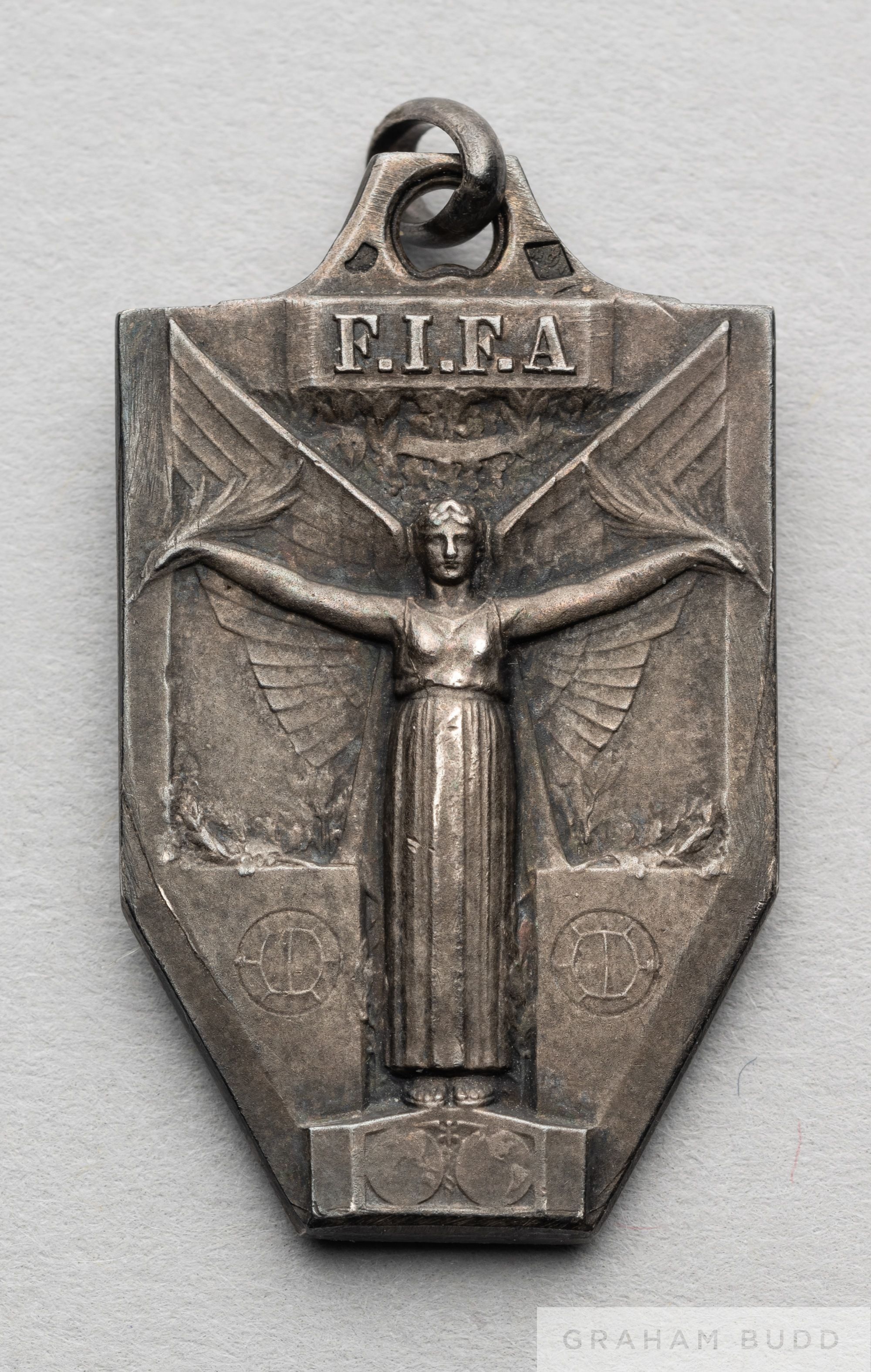 1938 France FIFA World Cup silver runners-up medal, made by Abel LaFleur (the creator of the Jules Rimet Trophy), obverse with FIFA and Victory in relief, reverse bearing WORLD'S CVP FIFA JUNE FRANE 1938, stamped with silver hallmarks, with suspension ring, weight 8gms., 35 by 21mm., with associated case Condition of medal is tarnished and case slightly worn
