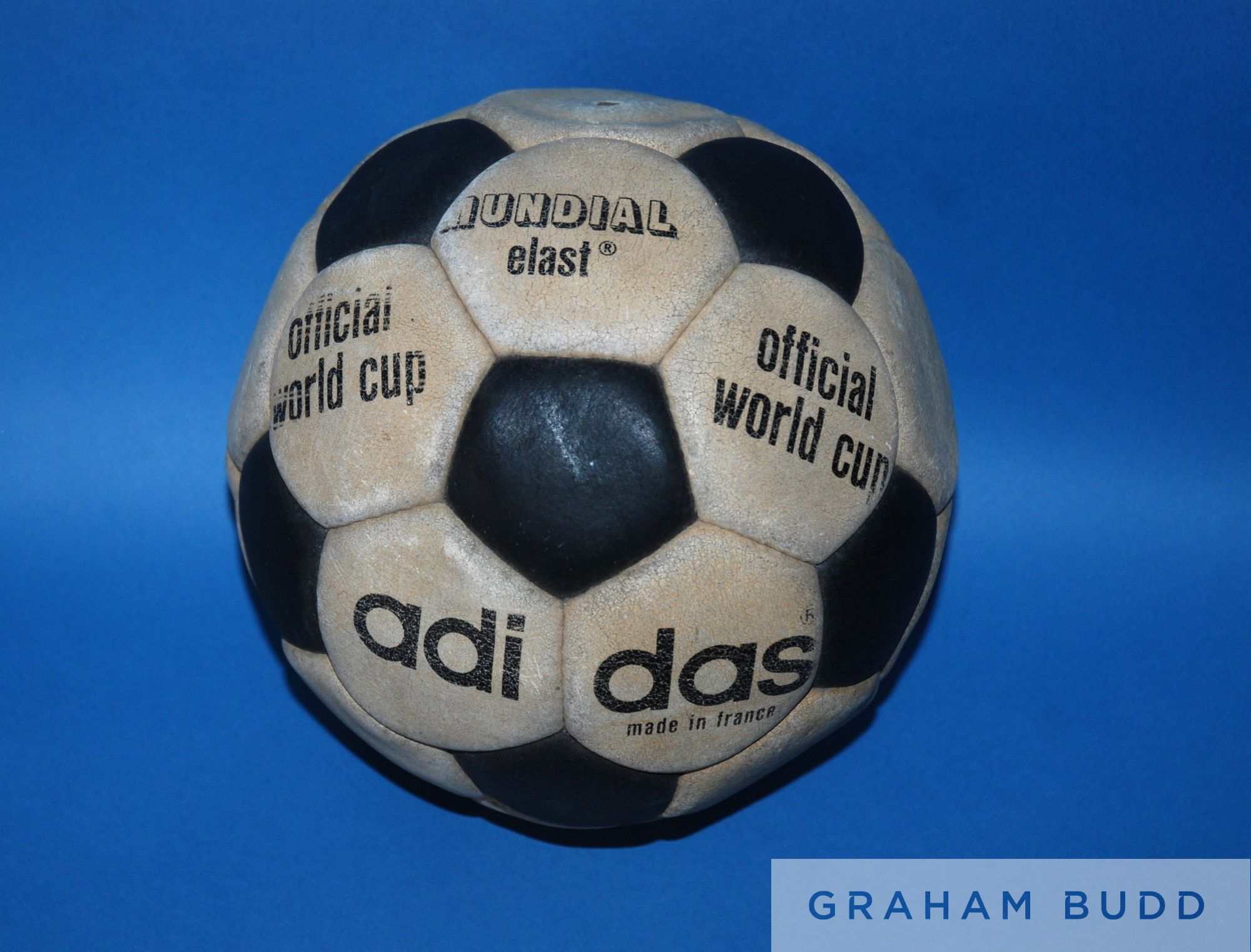 A rare black and white Adidas Mundial Elast 1970 World Cup sample ball stamped Mundial elast, Official World Cup, adidas, Made in France