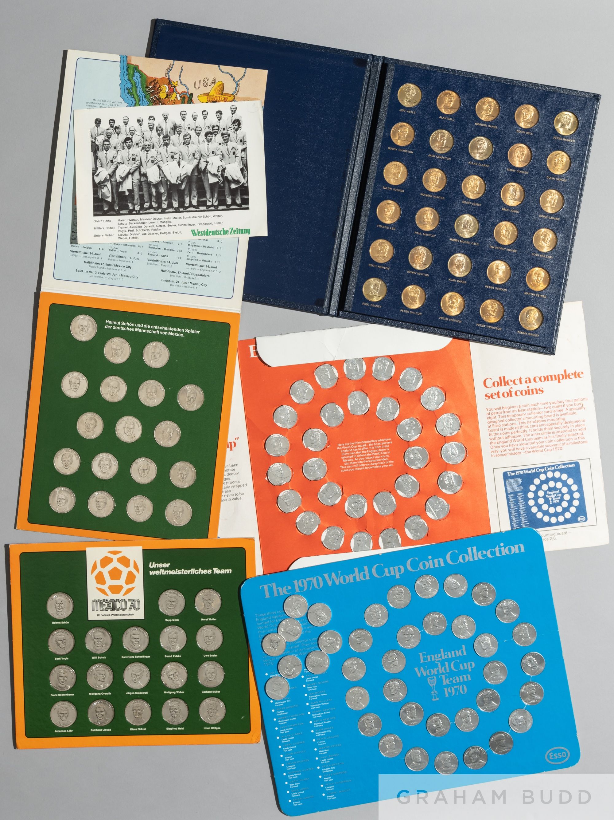 1970 World Cup collectors' coins, notably a limited edition solid bronze set by Franklin Mint presented by ESSO, in hardbound folder; with two sets of the public ESSO sets (one lacking Charlton, but including 9 duplicate coins of other players), housed in different style folders, with some spare duplicate coins; two sets of German issue coins sets presented by SHELL, one with original outer cover; the lot also including a photographic souvenir of the German 1970 team (6)