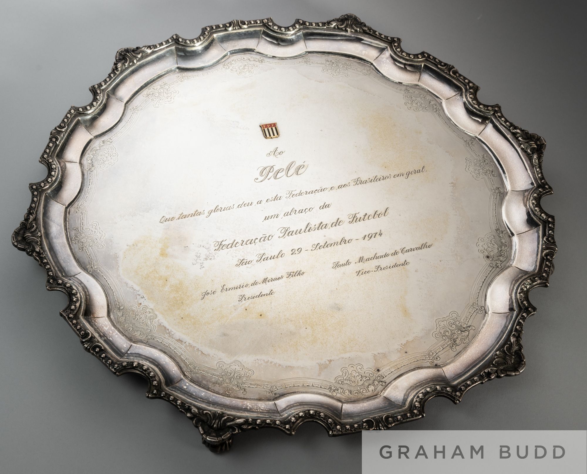 Ex-Pelé Collection: Paulista Football Federation trophy presented to Pelé to mark his retirement from Brazilian club football with Santos in 1974, In the form of an ornamental silver-plated salver, inscribed (translated) "To Pelé/For the many glories he gave to the Paulista Football Federation in general/ a hug from the Paulista Football Federation/ Saõ Paulo/ 29 de Setembro, 1974," diameter 48cm.